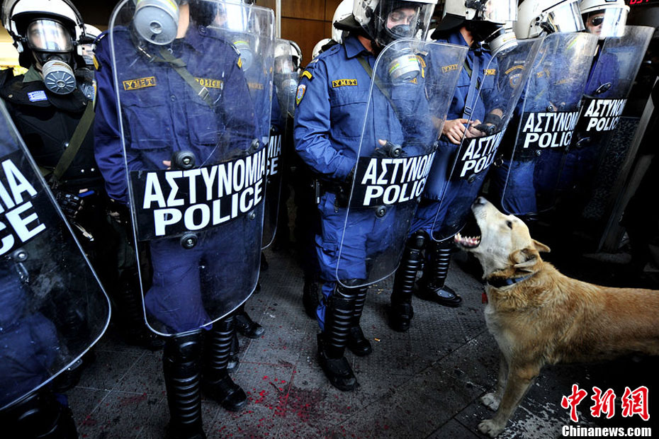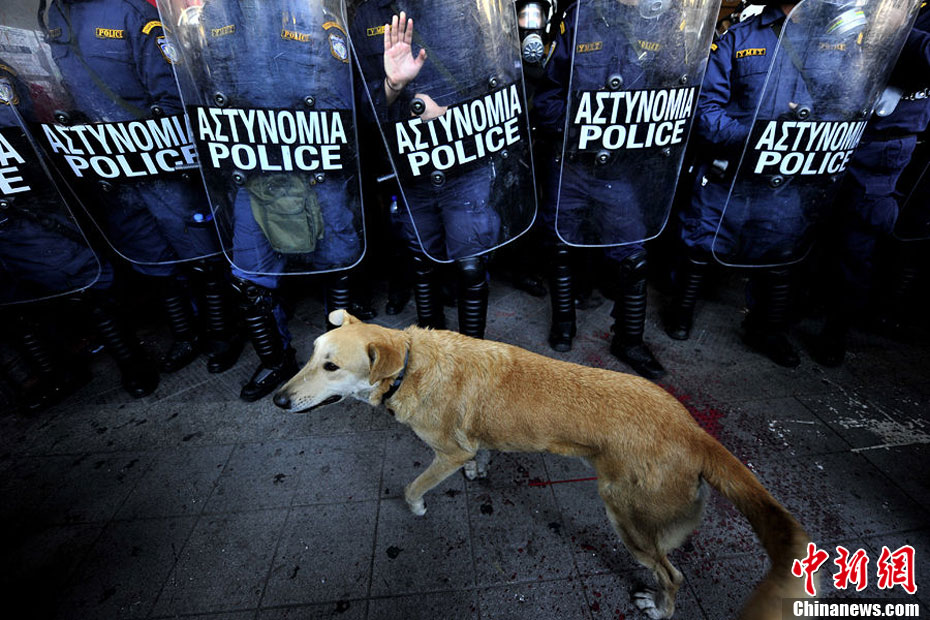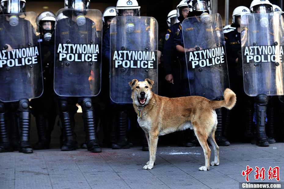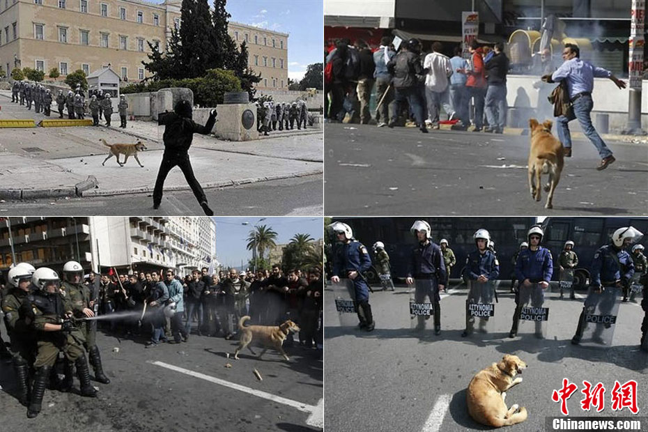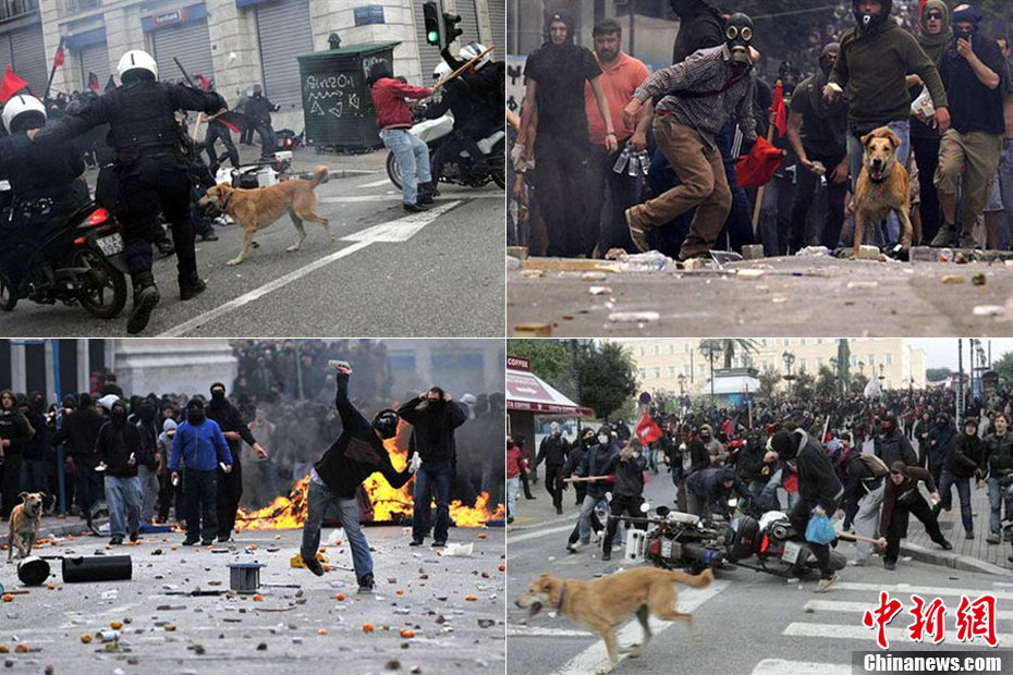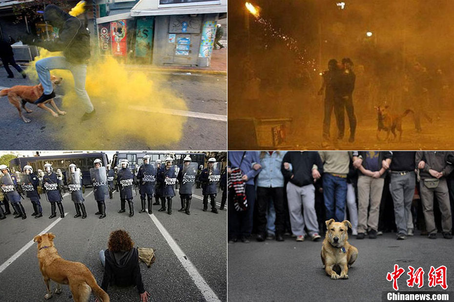 这只没有主人的黄狗据说从2008年开始,参加过希腊不下10场的街头抗议活动,似乎完全不怕催泪瓦斯、汽油弹等巨大爆炸声响,对于四面八方的人声尖叫,更像是乐在其中,甚至还懂得向警方吠叫,现在俨然成为希腊抗议人士的吉祥物,甚至还有网友为它建立专属的Facebook主页。