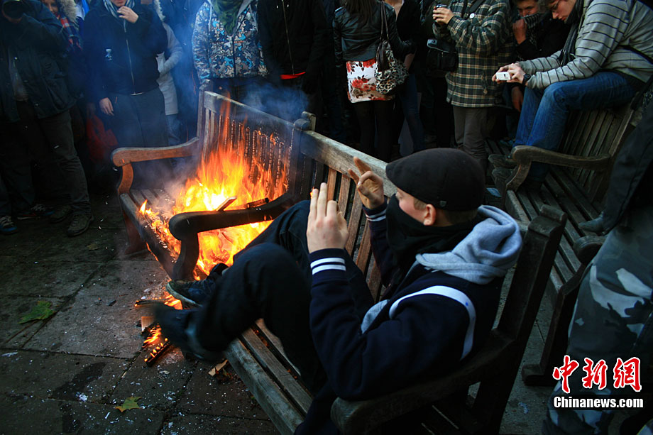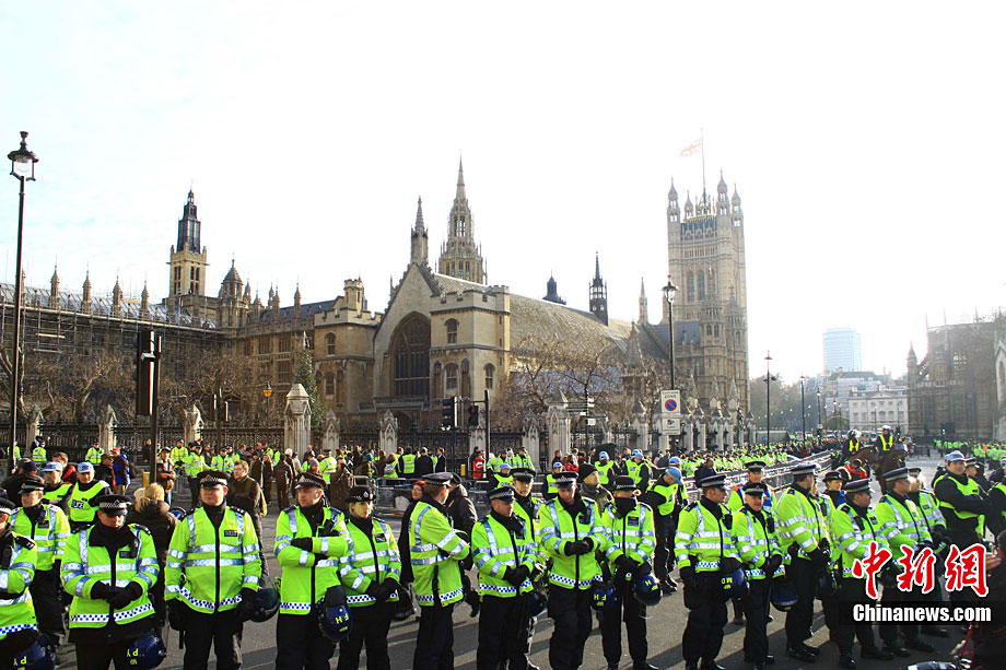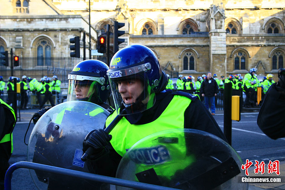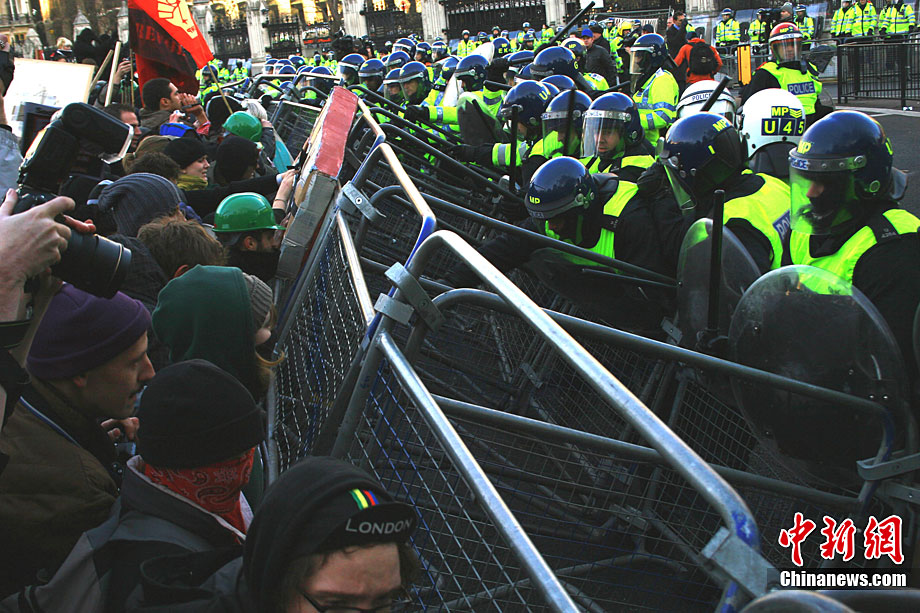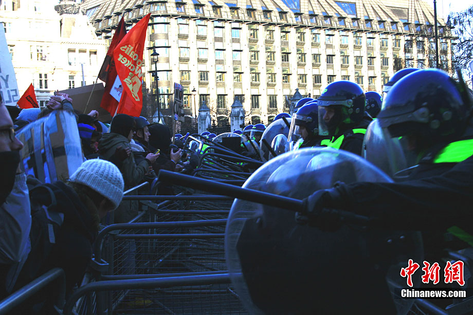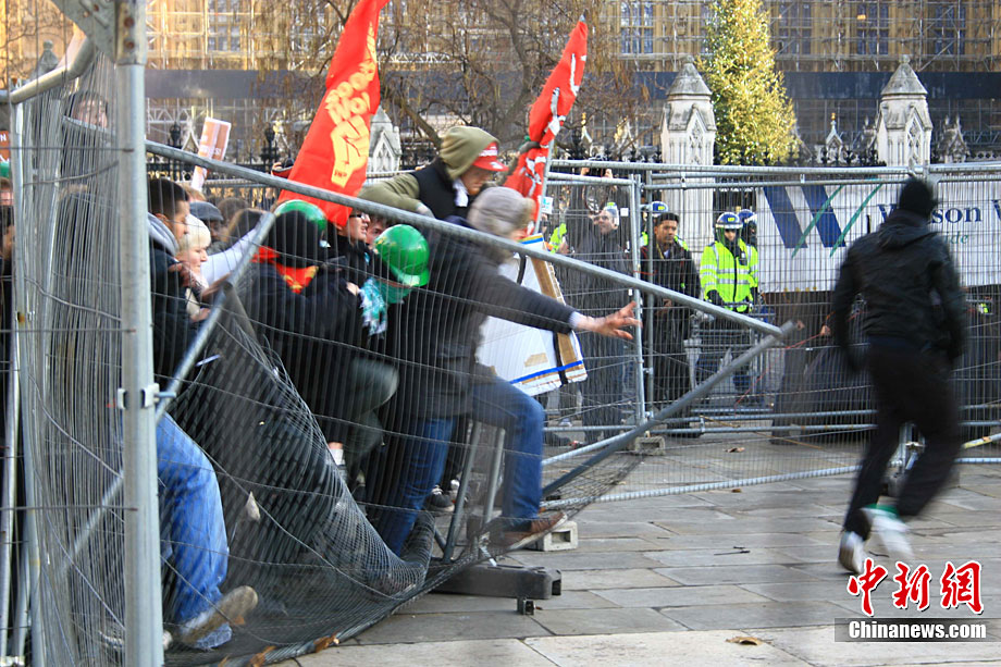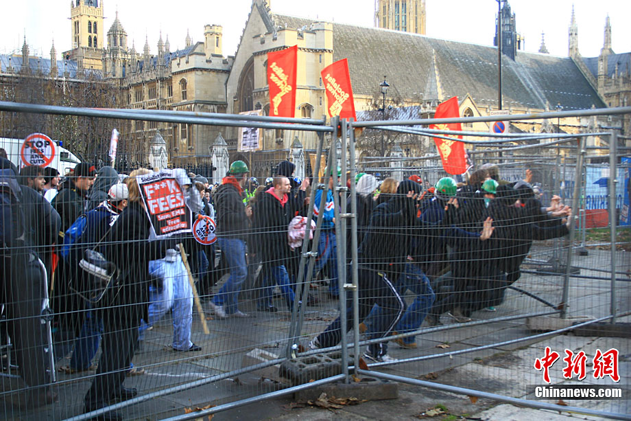 当地时间12月9日,为抗议议会表决通过政府有关大学学费上涨提案,伦敦爆发大规模学生抗议示威,引发示威者与警方冲突,37人受伤,15人被捕。图为示威者冲破议会大厦前广场施工栅栏。中新社记者 魏群 摄