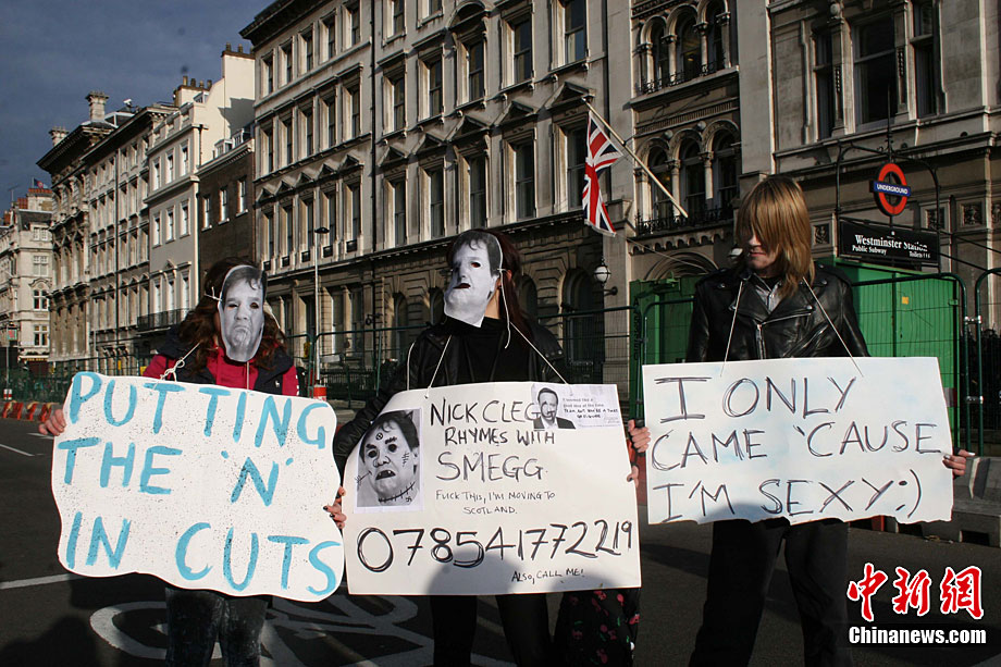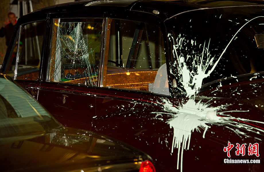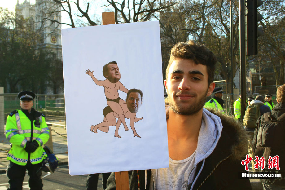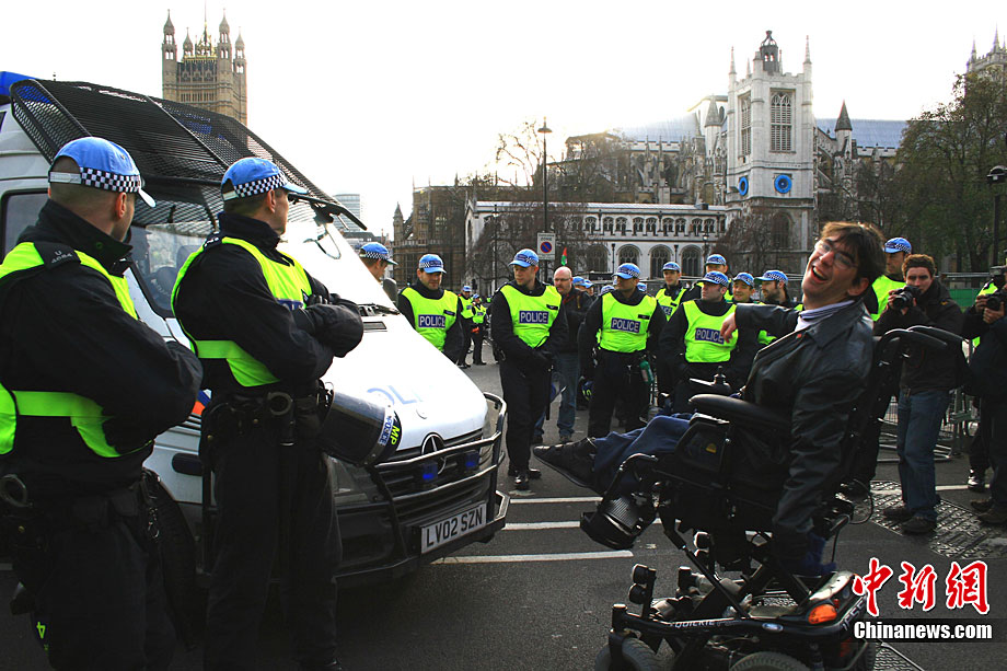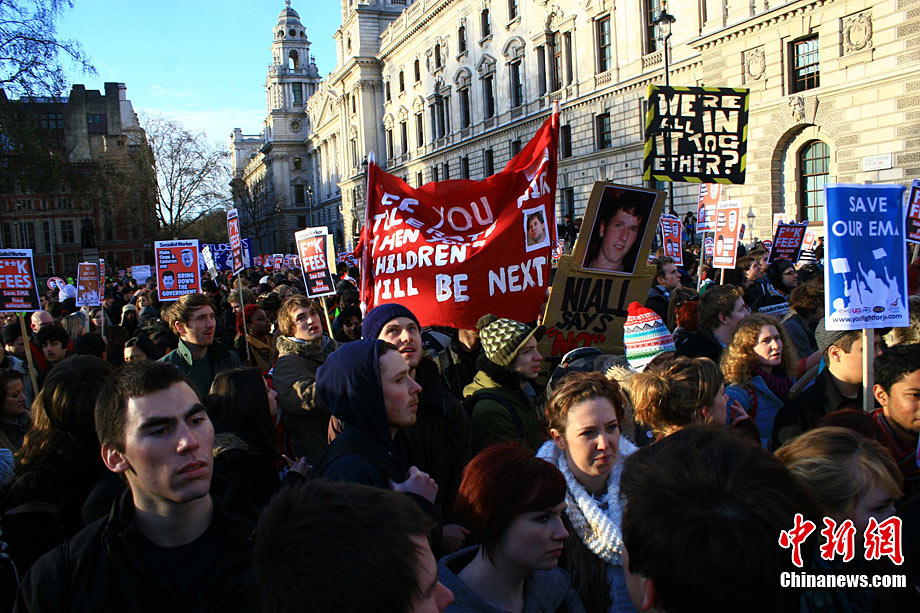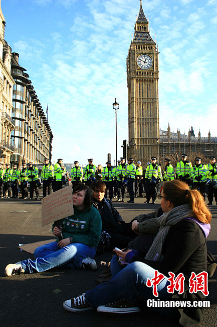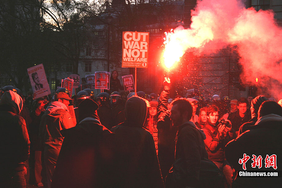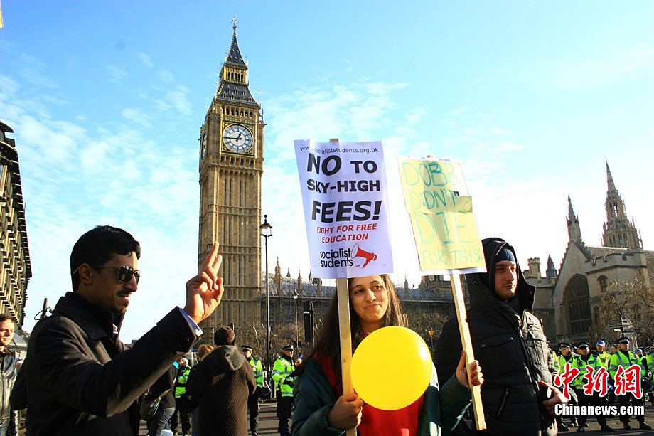 当地时间12月9日,为抗议议会表决通过政府有关大学学费上涨提案,伦敦爆发大规模学生抗议示威,引发示威者与警方冲突,37人受伤,15人被捕。图为示威者冲破议会大厦前广场施工栅栏。中新社记者 魏群 摄