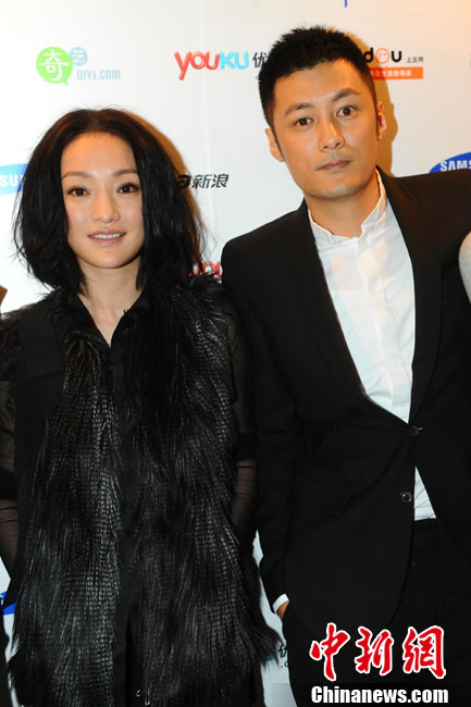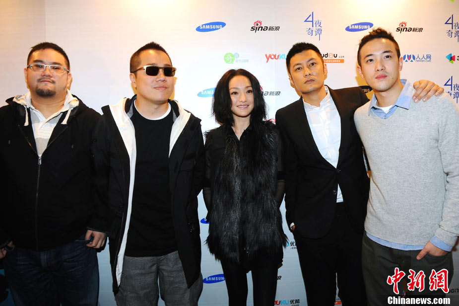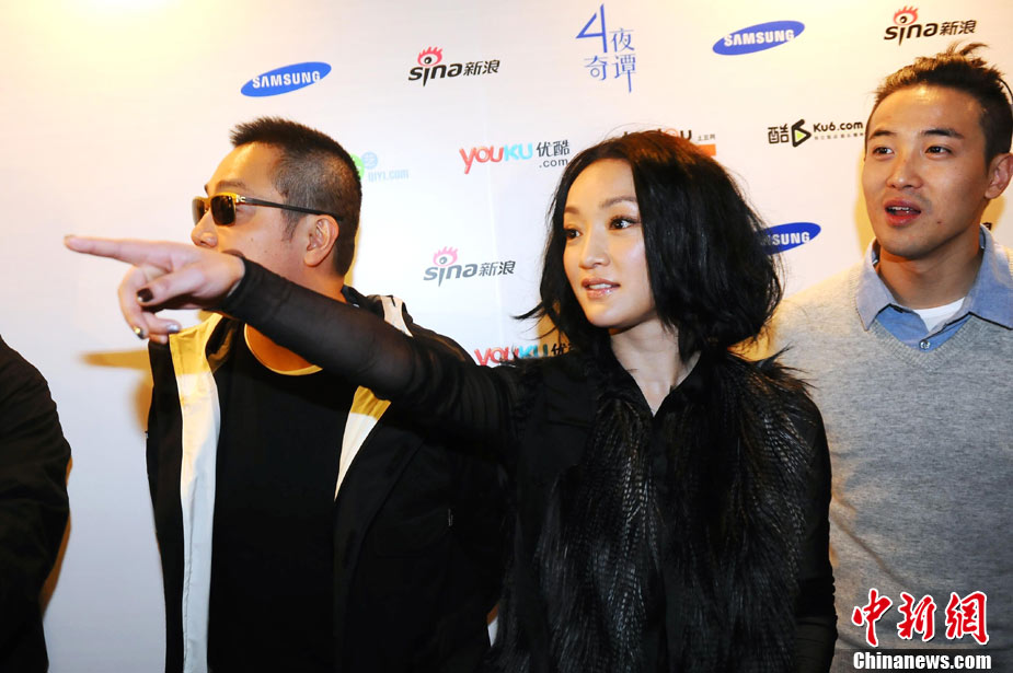 12月10日,网络电影营销峰会暨《4夜奇谭》流量超高庆功会在京举行,监制彭浩翔、导演曾国祥、尹志文、陈正道和主演周迅、余文乐一同亮相。作为香港鬼才导演彭浩翔进军内地首部作品,《4夜奇谭》在各大网站累计点击量突破2.1亿人次创下网络电影新高,其营销模式受到业界关注,被专家誉为开创了“中国网络电影元年”。图为活动现场,周迅、余文乐获赠某品牌即将上市的超大号手机。中新社记者 李学仕 摄