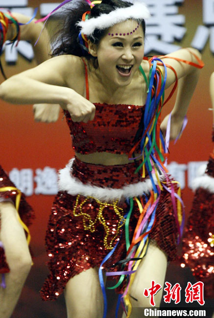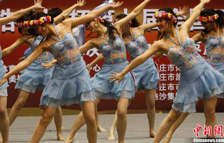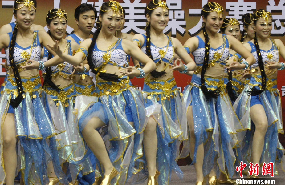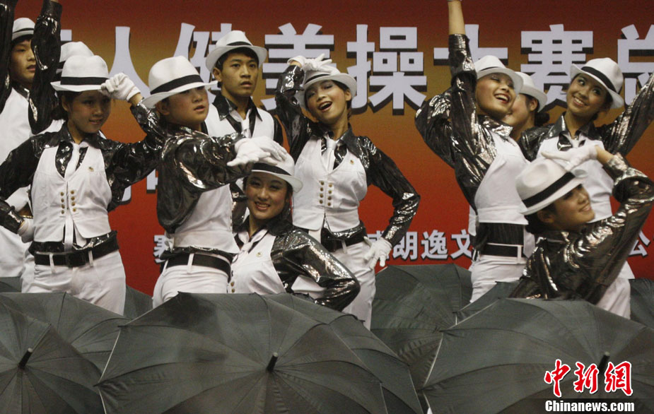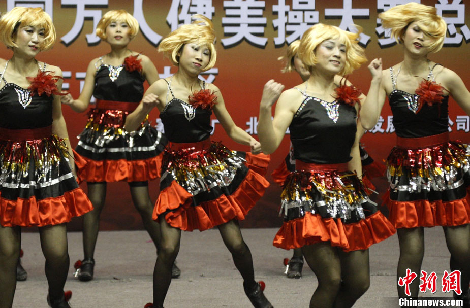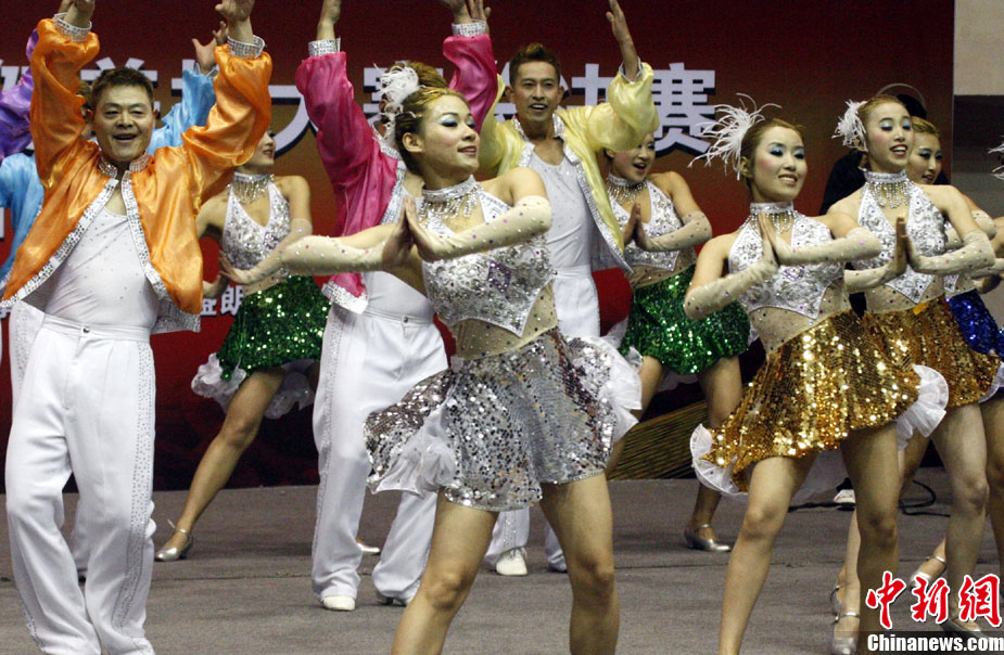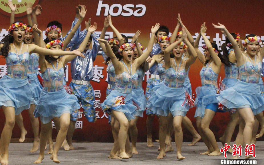 12月10日晚,正在山东枣庄市体育馆举行的2010年第9届“浩沙杯”中国内地万人健美操大赛总决赛上,来自中国内地20个赛区的优秀团队以风格不同、绚丽多姿的“排舞”形式比赛。全民健身排舞是集舞蹈、运动和文化于一体的舞蹈形式,因其健身性、娱乐性、观赏性和群众性的特点而深受人们喜爱。图为参赛的各“排舞”队在赛场上展示风采。