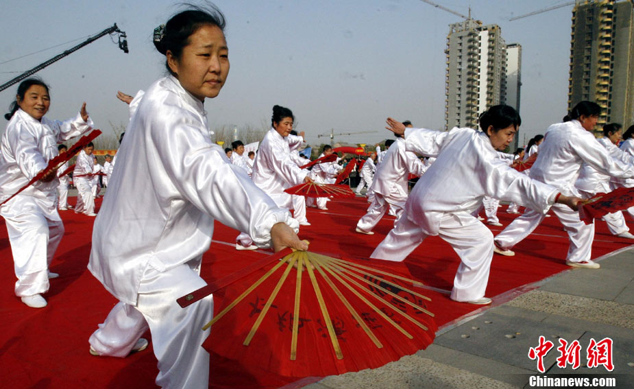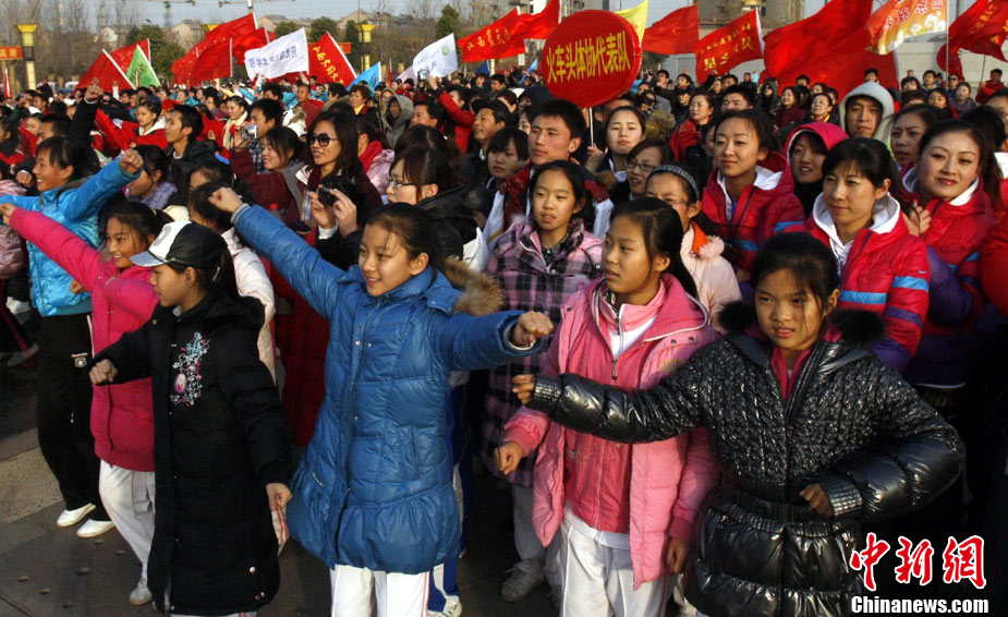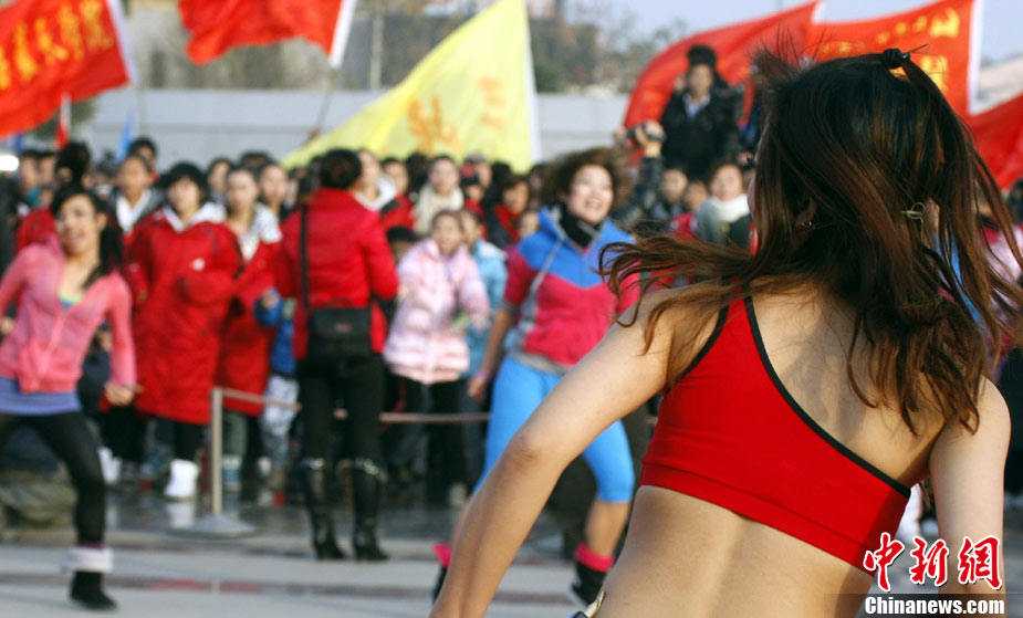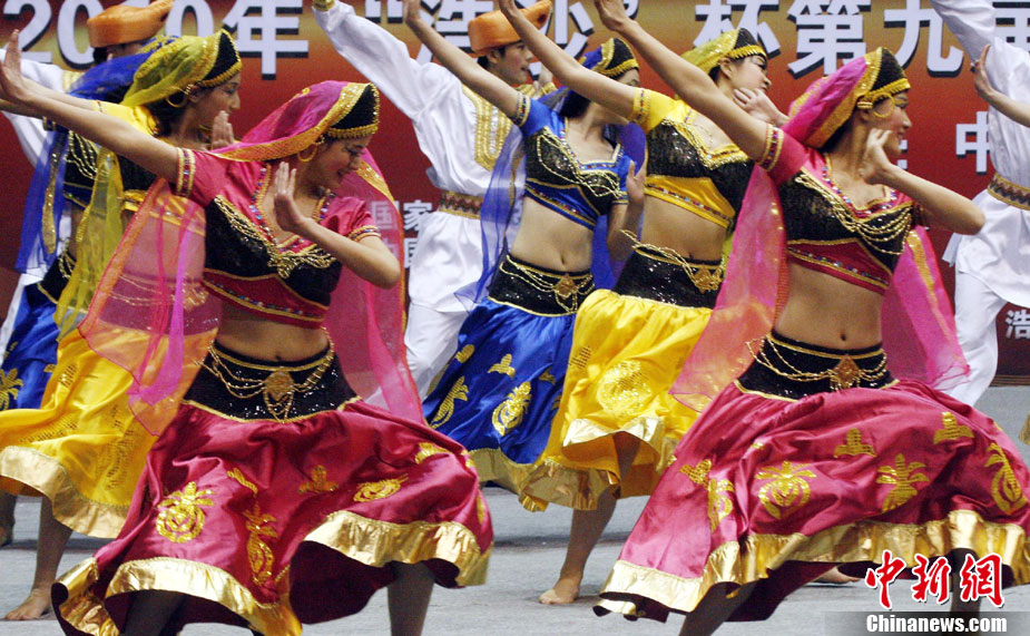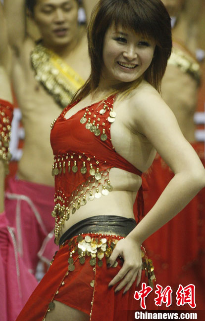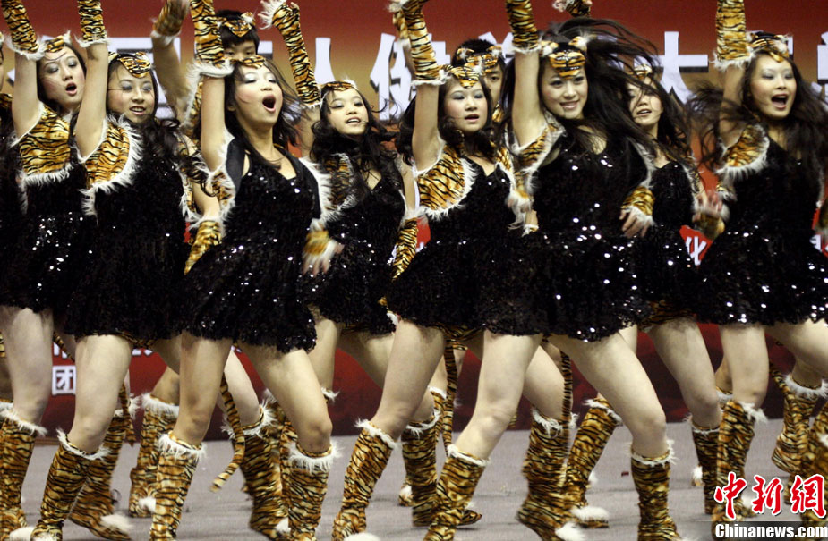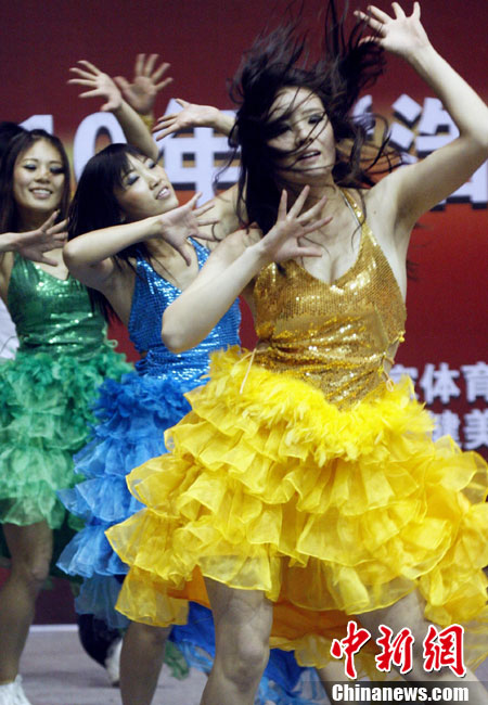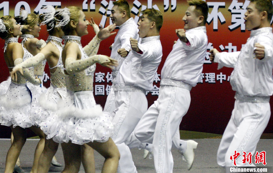 12月10日晚,正在山东枣庄市体育馆举行的2010年第9届“浩沙杯”中国内地万人健美操大赛总决赛上,来自中国内地20个赛区的优秀团队以风格不同、绚丽多姿的“排舞”形式比赛。全民健身排舞是集舞蹈、运动和文化于一体的舞蹈形式,因其健身性、娱乐性、观赏性和群众性的特点而深受人们喜爱。图为参赛的各“排舞”队在赛场上展示风采。