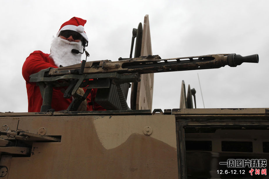 12月6日(周一),一名身着圣诞老人服装的德国士兵乘坐在装甲车上前往阿富汗昆都士执行任务。