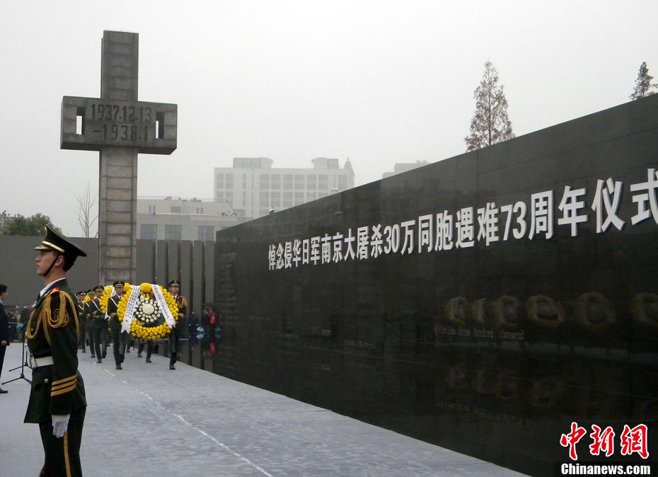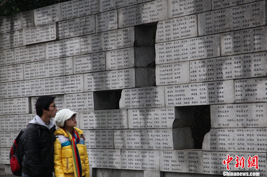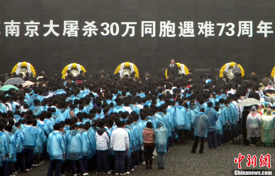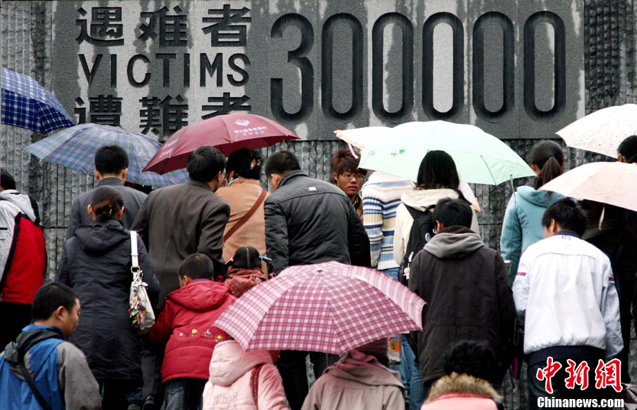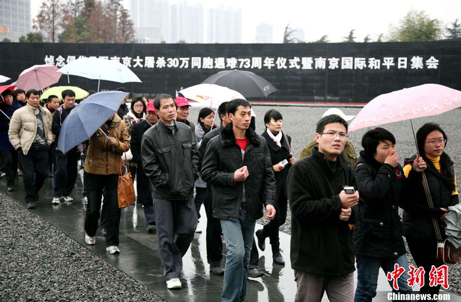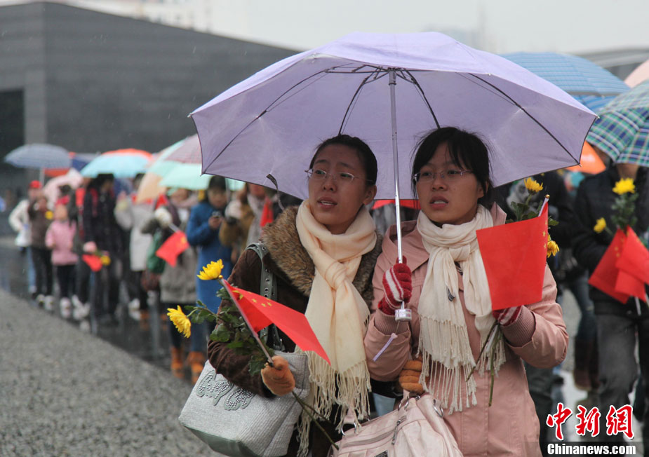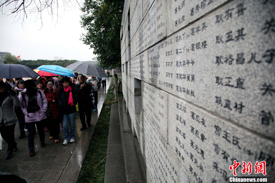 12月13日是南京大屠杀遇难同胞73周年祭日,12日起,江苏南京将举行和平集会、和平法会等系列活动,悼念30万遇难同胞。图为南京市民12日冒雨前往南京大屠杀遇难同胞纪念馆悼念。 钟山 摄 图片来源:CNSPHOTO
