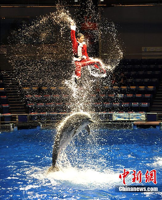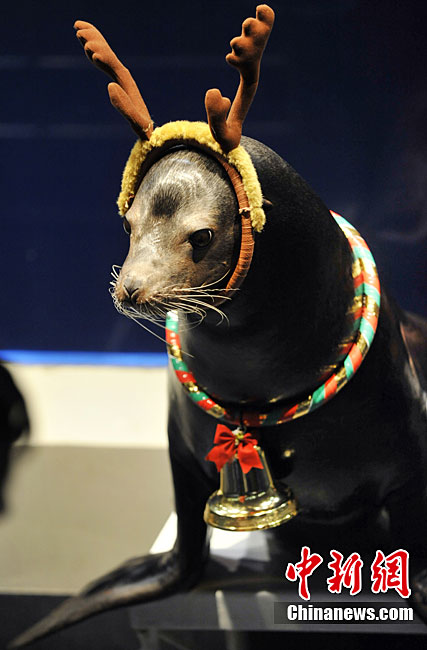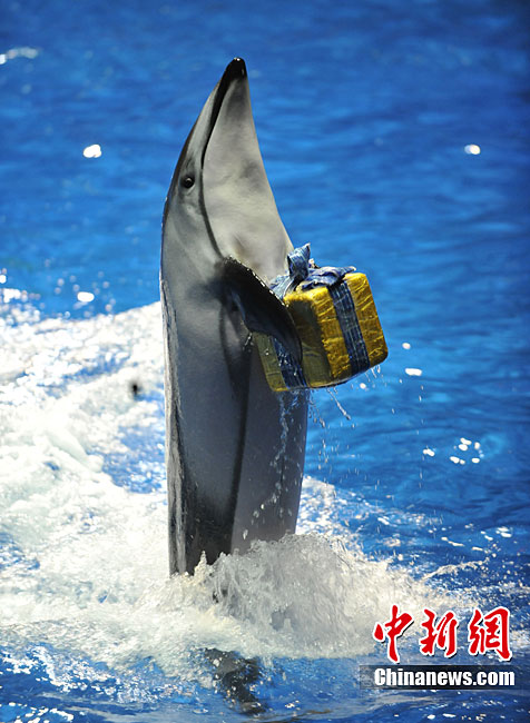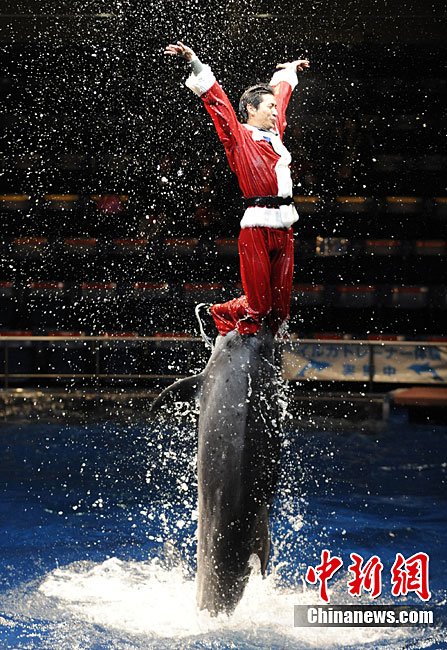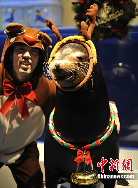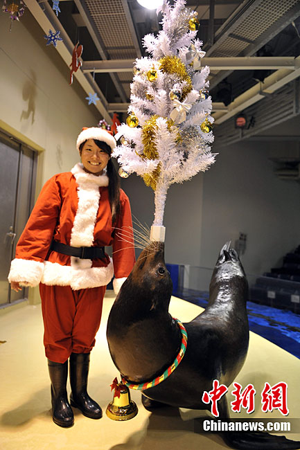 当地时间12月13日,日本东京一家水族馆内的海洋动物进行了一场精彩的圣诞表演。海豹、海豚为现场观众送去了一件件圣诞礼物。