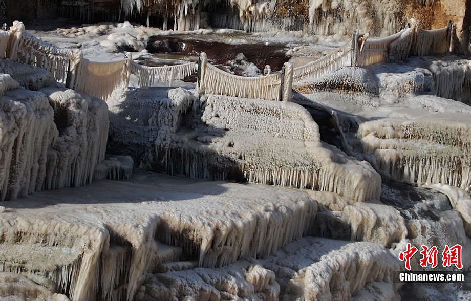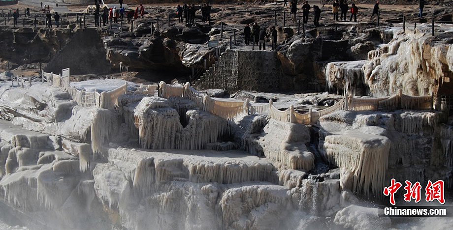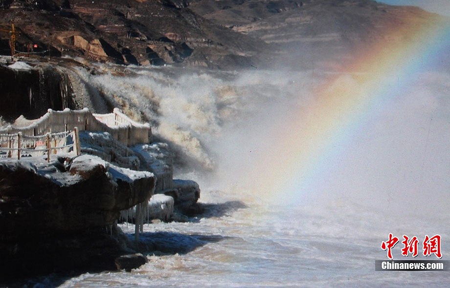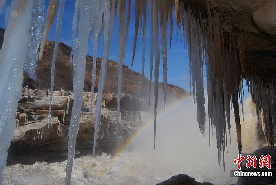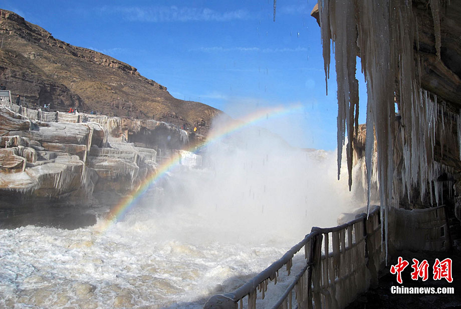 12月15日,受大风降温天气的影响,黄河壶口段开始大面积流凌。壶口瀑布两岸的岩石和护栏上也开始凝结一排排美丽壮观的冰挂,晶莹剔透,造型各异,与瀑布中飞舞的彩虹交相辉映,为冬日的壶口瀑布平添了几分秀色,让许多游客流连忘返,频频举起手中的相机拍照留念。吕桂明 摄 图片来源:CNSPHOTO