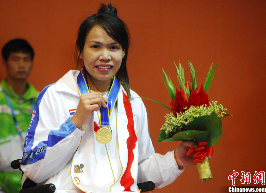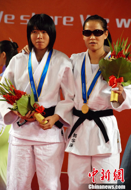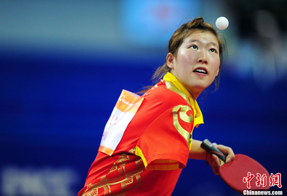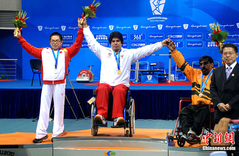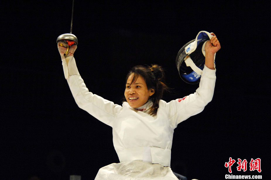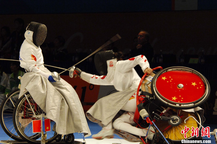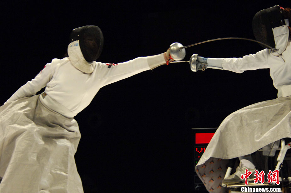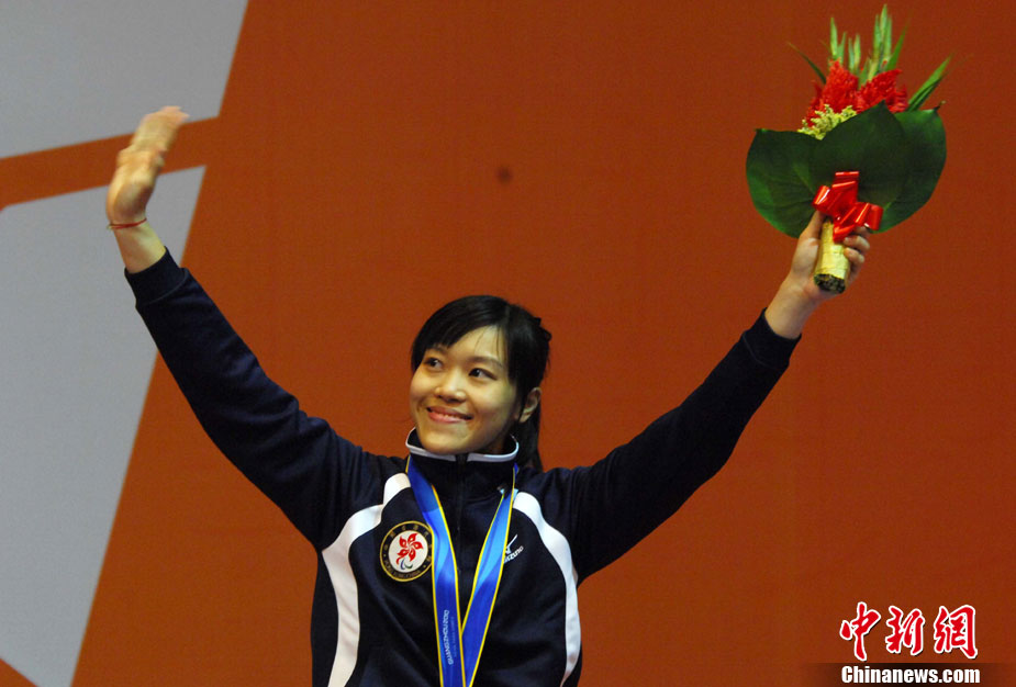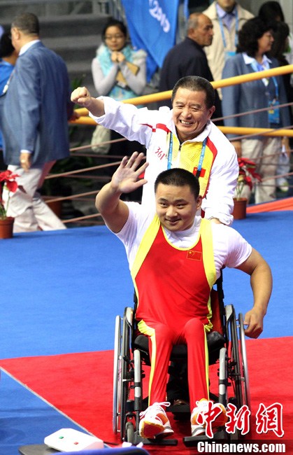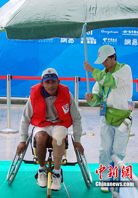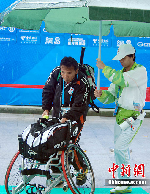 12月15日,志愿者雨天为运动员撑伞护航,无微不至。广州2010亚残运会,轮椅网球比赛在广州天河体育中心网球学校举行,因雨比赛从室外转向室内。尹雪峰 摄