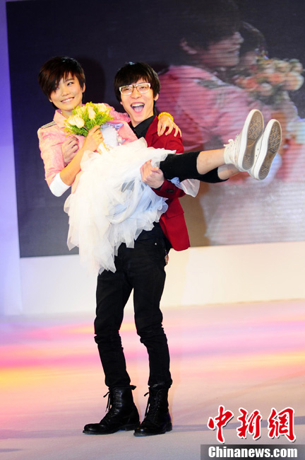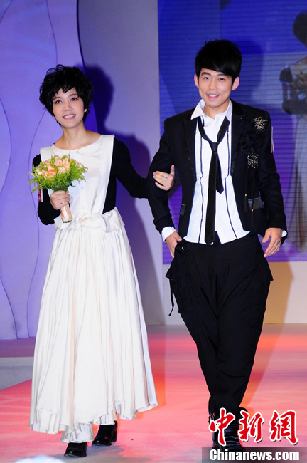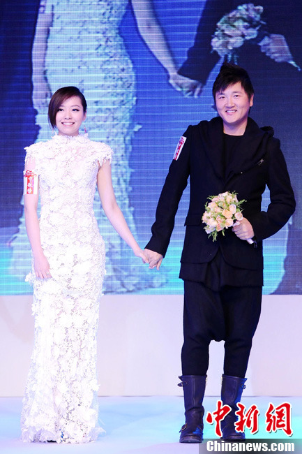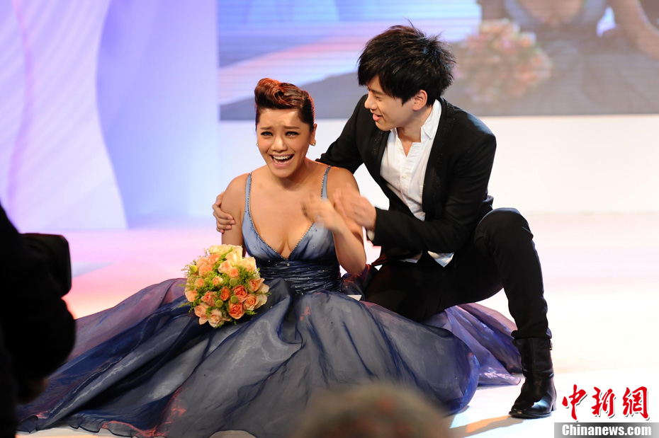 本次提名发布会设计成为“婚纱主题派对”。发布会一开场,舞台上两两出现的依次是苏醒和李霄云、王啸坤和许飞、极泷和谭维维、张杰和江映蓉、陈楚生和尚雯婕、李宇春、孙楠和张靓颖、羽泉哥俩,这一组组人马出现,竟然是统一身着婚礼服装亮相。出席歌手中不乏“最佳男女歌手”、“最受欢迎男女歌手”、“最佳专辑”等大奖提名获得者,这一场“集体婚礼”集结了近20位内地歌坛中坚力量,可谓本年度歌坛最具创意的一次主题表演。图为江映蓉、张杰。