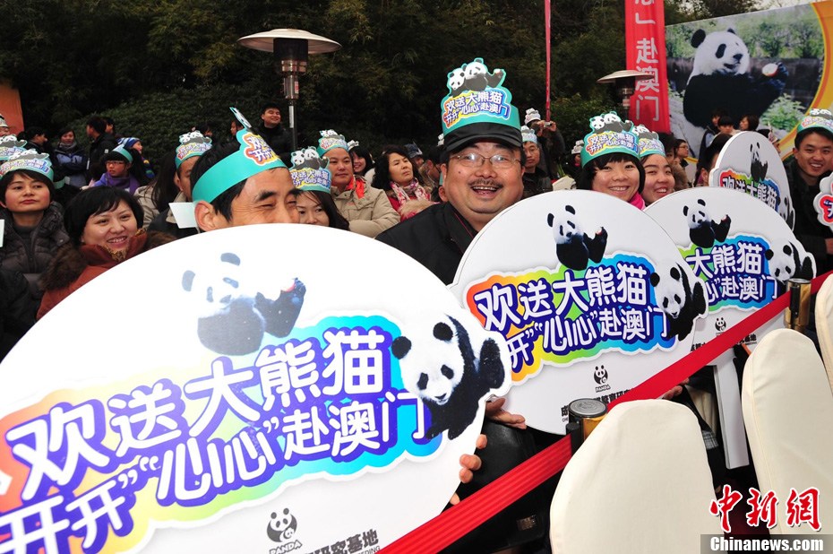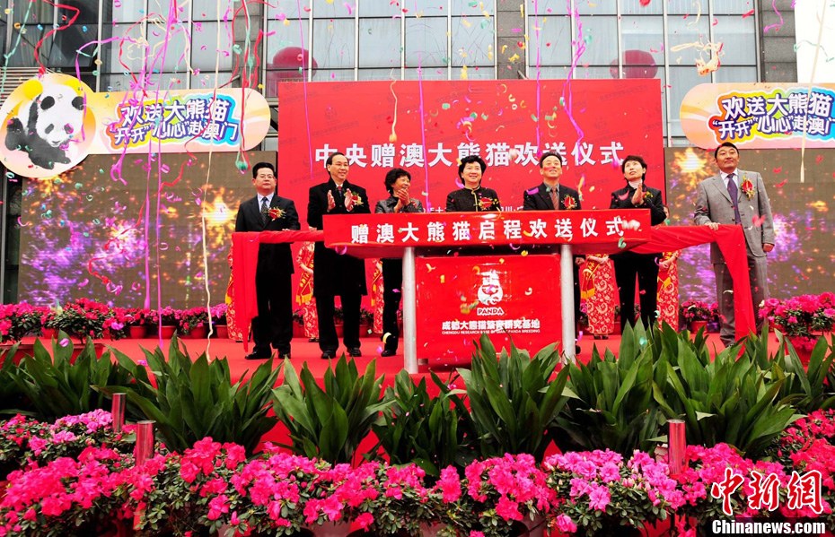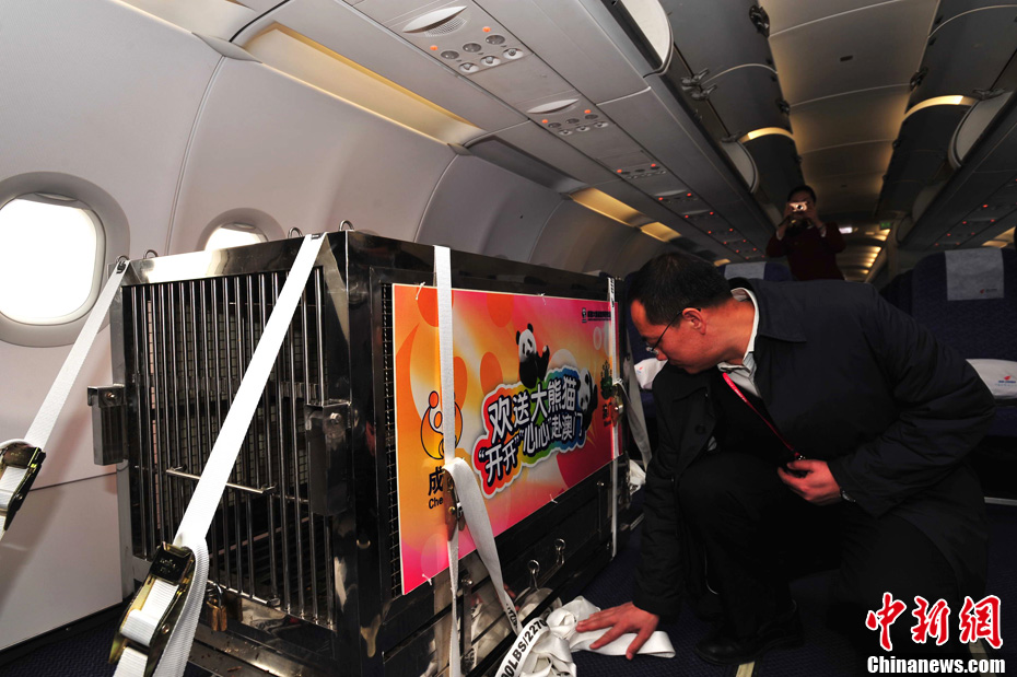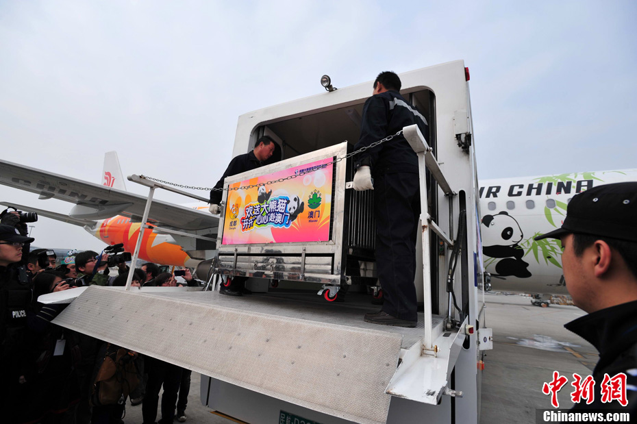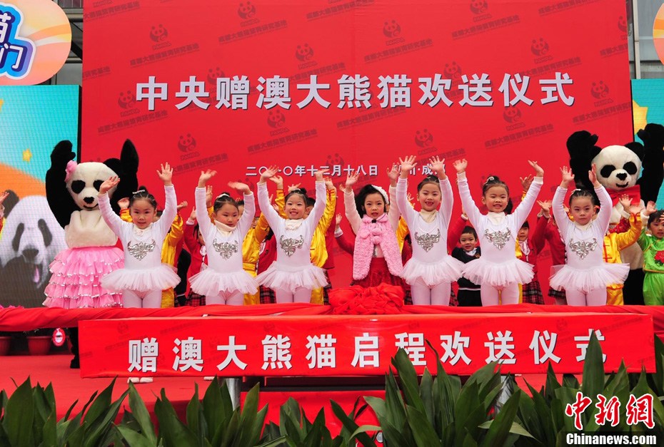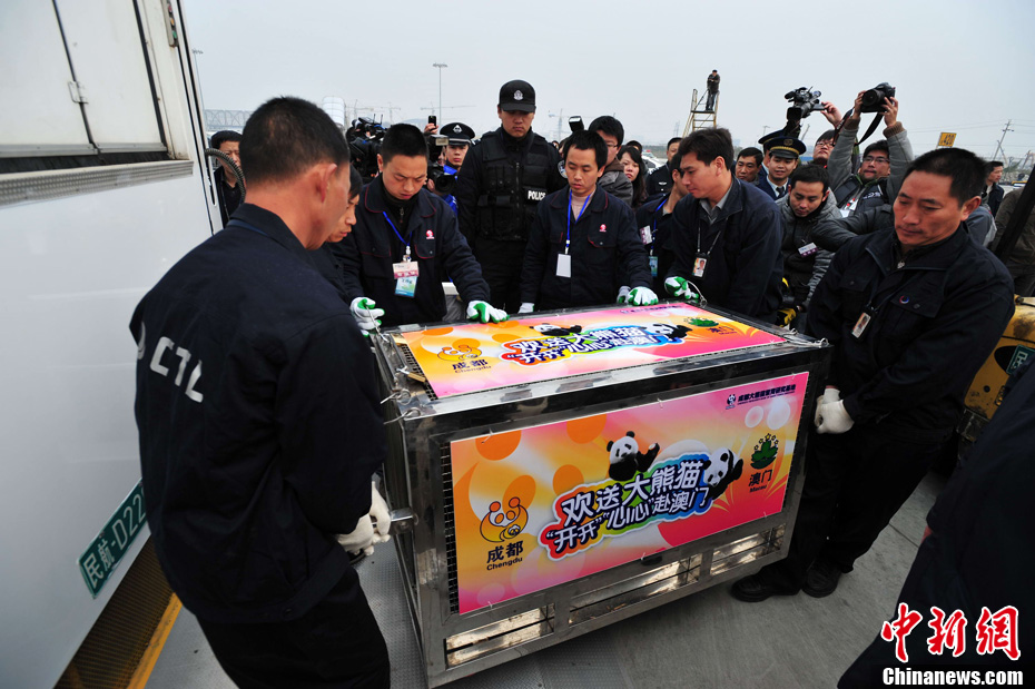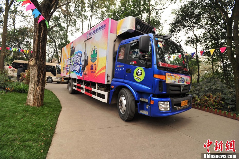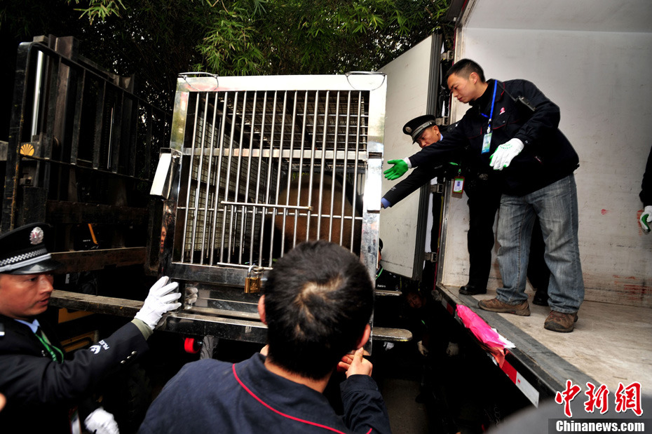 12月18日上午,中央赠澳大熊猫欢送仪式在成都大熊猫繁育研究基地的科学探秘馆广场举行。仪式后,工作人员将装运“开开”、“心心”的专用笼子搬上专车,开离成都大熊猫繁育研究基地,赴成都双流国际机场。中新社发 安源 摄