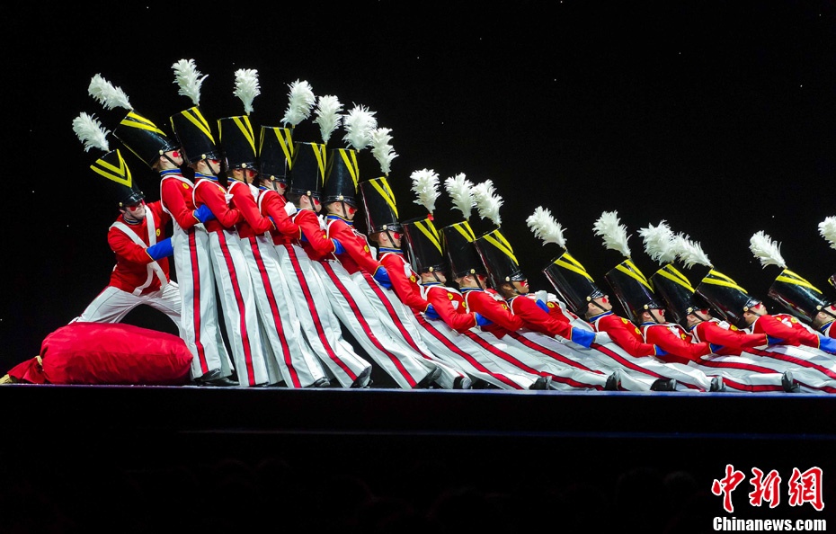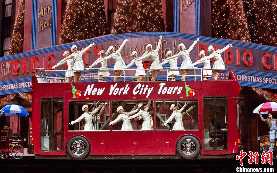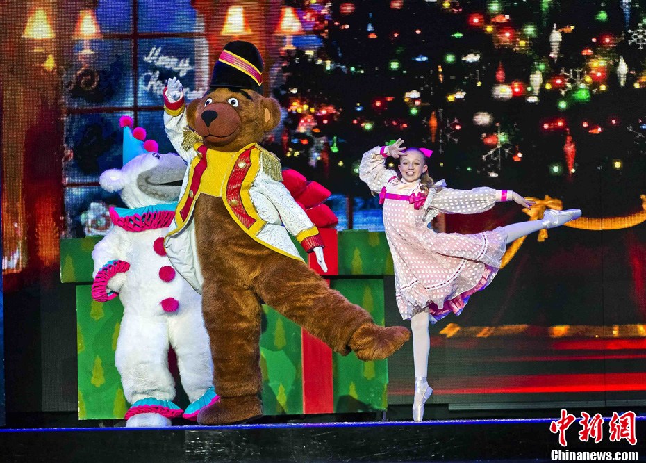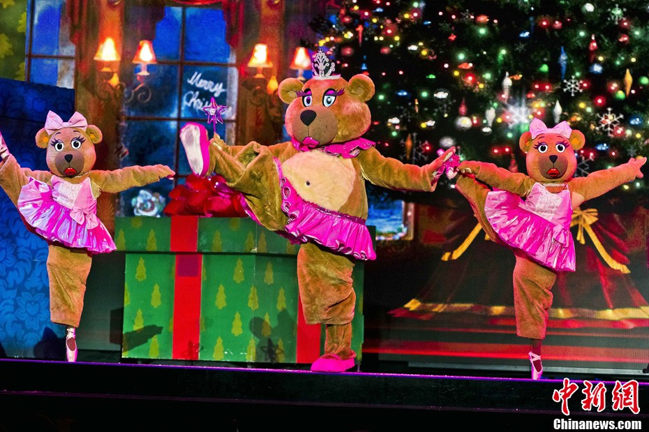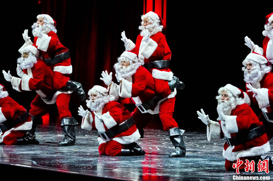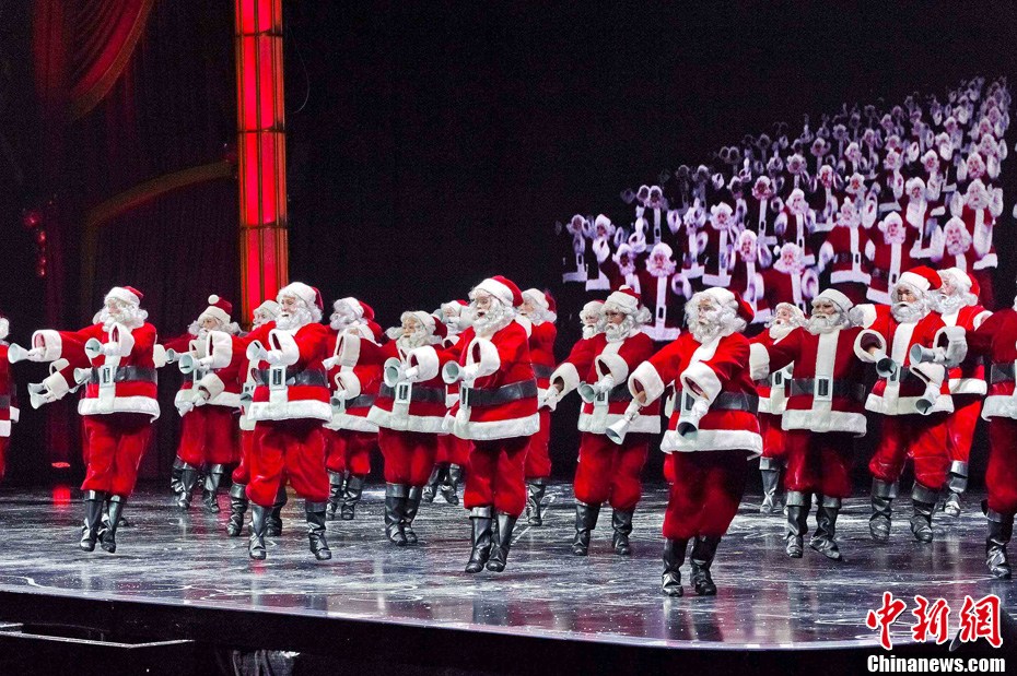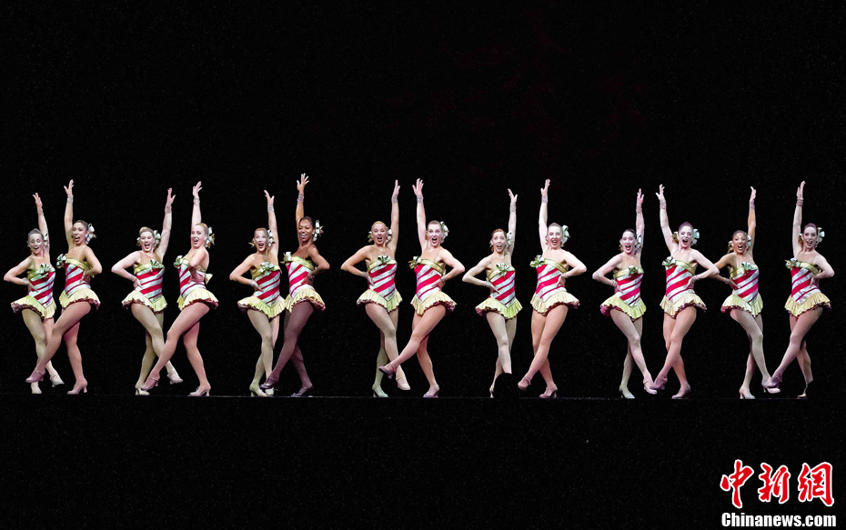 当地时间12月17日晚,美国加州奥克兰甲骨文体育馆内,美国火箭女郎舞蹈团圣诞秀热闹登场。78年历史的火箭女郎舞蹈团1932年在纽约第六大道的无线电城音乐厅首演,以舞蹈演员整齐划一的踢腿和充满圣诞气氛的布景成为美国传统节日的经典剧目。演员们在每场演出中单是踢腿到头顶的动作就达300下。中新社发 陈钢 摄