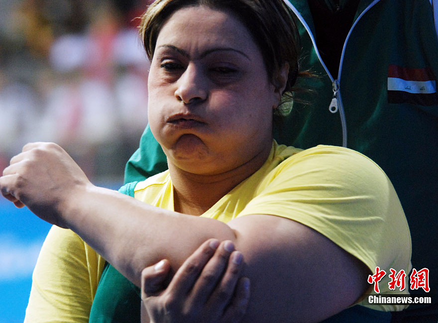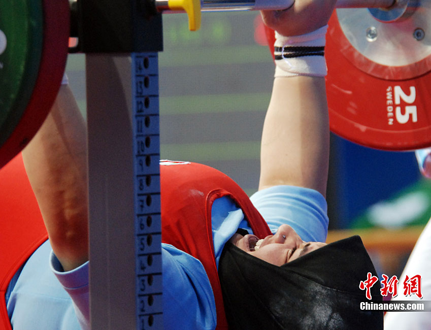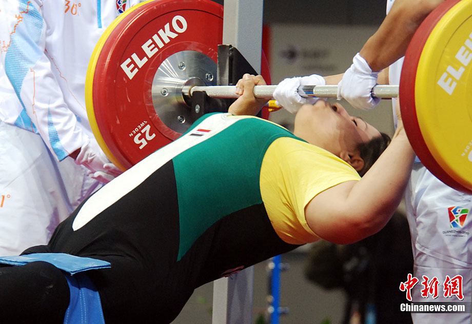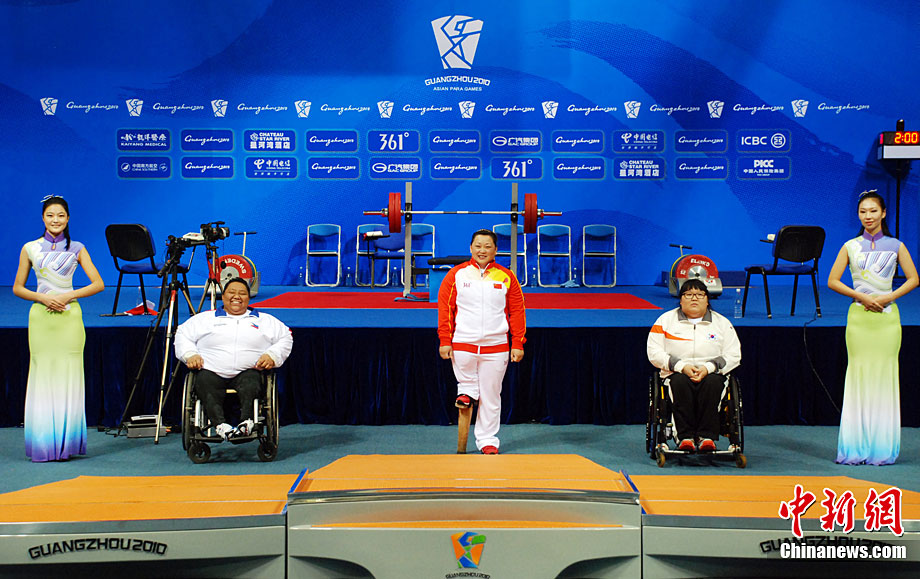 12月18日,广州2010亚残运会,女子82.50公斤以上级举重比赛在亚运城体育馆举行,中国选手李凤梅以130kg的成绩夺得冠军。图为举重比赛现场。尹雪峰 摄