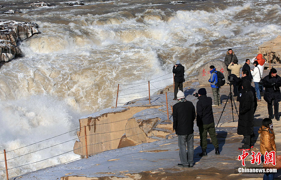 12月17日,黄河壶口冰冻瀑布在阳光照射下异常美丽,引得八方游客前来观赏美景。据了解,这是由于近期受冷空气影响,形成的美丽自然景观。张旦 摄 图片来源:CNSPHOTO