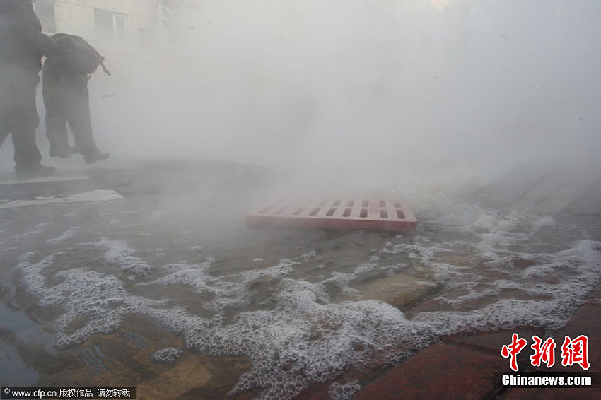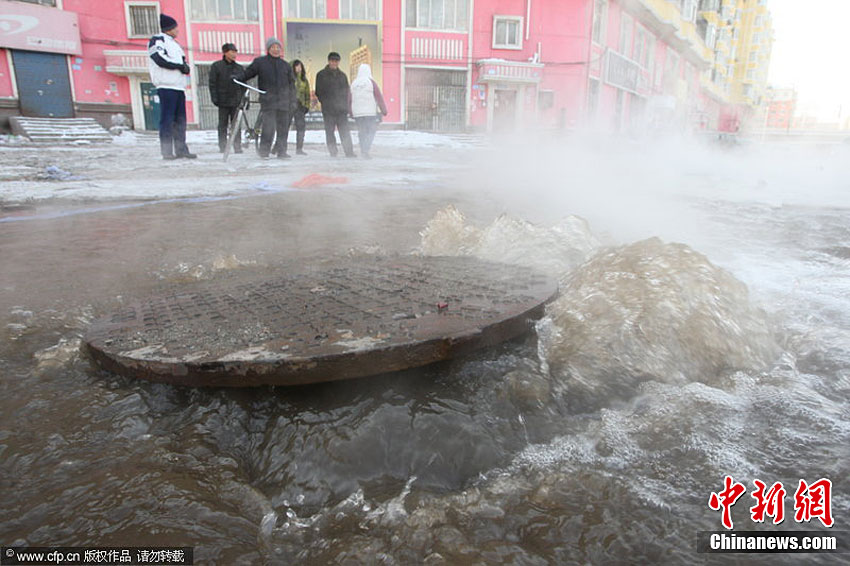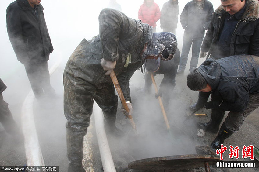 近日,黑龙江省哈尔滨市供热管线接连爆裂。从12月14日至今,道里区、道外区约12万户居民供暖中断。华能公司经理赵世雷解释说,造成这几次大的停热事故的主要原因是补偿器破裂。18日夜间开始,哈尔滨市降下大雪,最低气温接近零下30摄氏度。小刚 摄 图片来源:CFP视觉中国