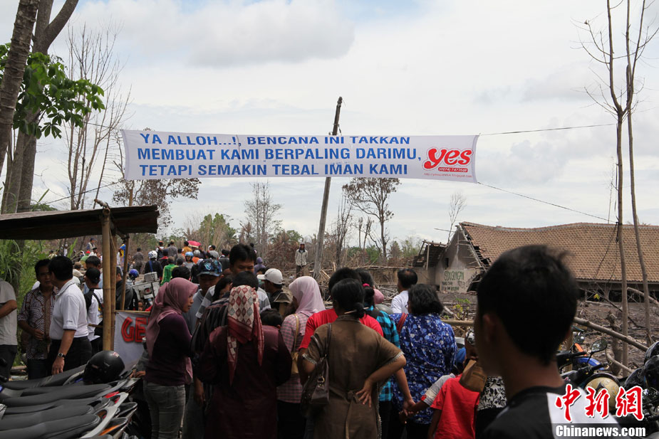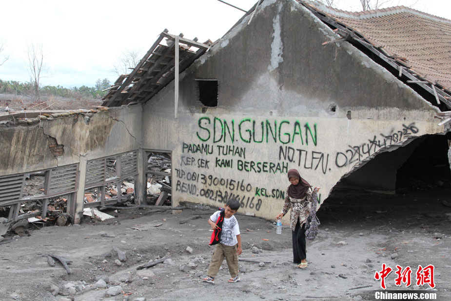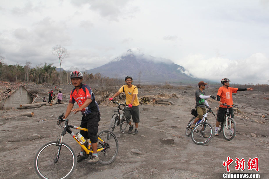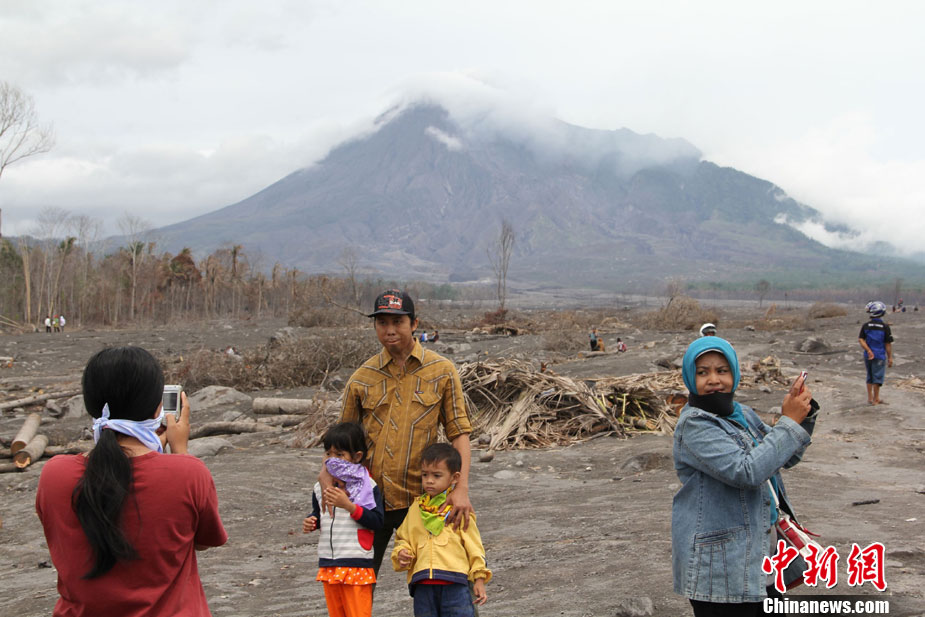今年10月下旬,位于印尼日惹市的默拉皮火山在沉睡百年后,再次大规模数次喷发,并造成300多人罹难、成千上万人受伤,数十万人撤离家园。默拉皮火山11月份停止喷发后,来自印尼各地的民众纷纷来此旅游观光。火山脚下一个叫GUNGAND被火山岩浆埋没的村庄,每天来旅游的人数逾5000人。图为当地民众在拍照留念。中新社发 顾时宏 摄