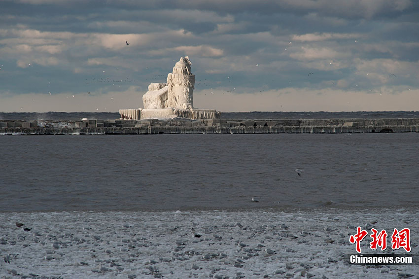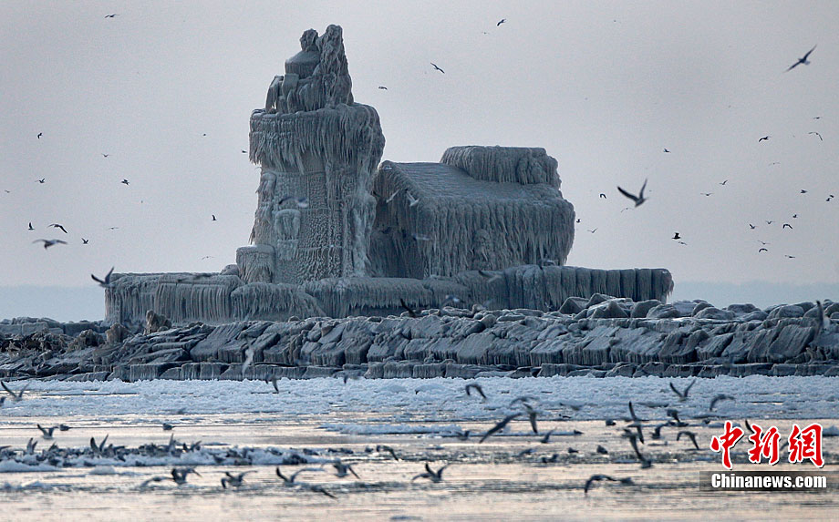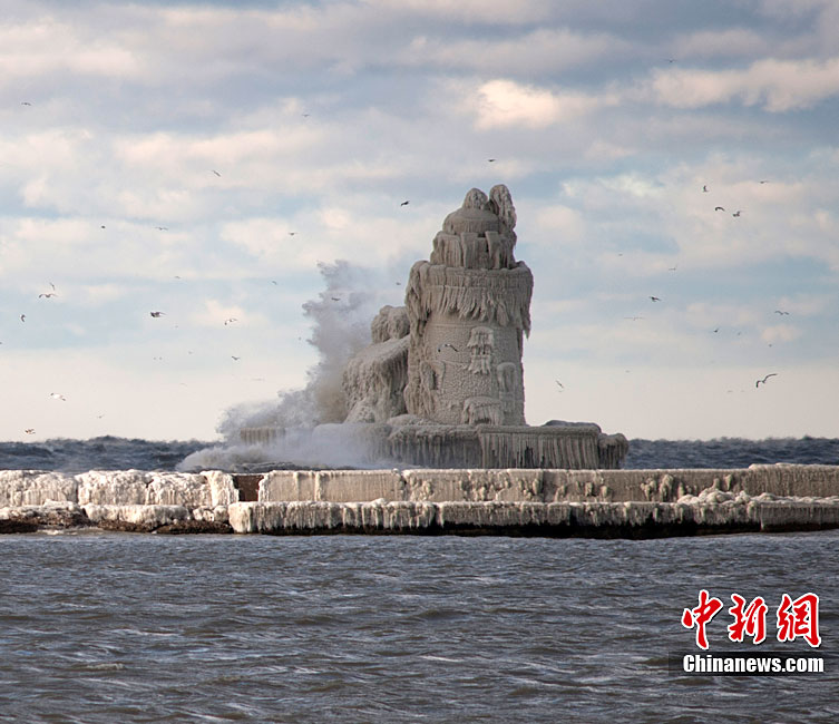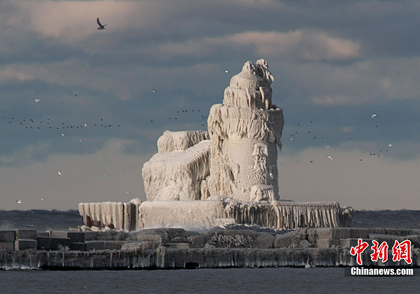 受暴风雪影响,一座位于美国俄亥俄州伊利湖克利夫兰港的灯塔近日完全被冰层覆盖,从远处望去,仿佛一座冰雪雕刻的中世纪古堡。