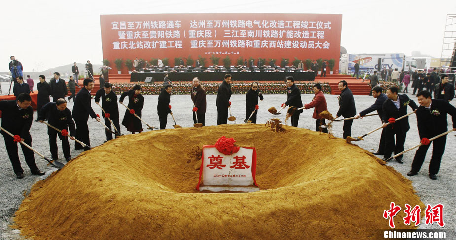 12月22日,重庆市委书记薄熙来宣布“宜万铁路开通”,这标志着世界建设难度最大铁路正式竣工通车。这条被誉为中国“西南山区铁路艰险之大成者”的铁路,连接重庆万州与湖北宜昌,总投资225.7亿元,全长377公里,其桥隧比例高达74%,共有隧道159座,其中七成位于石灰岩地区,溶洞、暗河密布,突水突泥的风险程度极高。据悉,宜万铁路于2003年12月开工,2010年8月18日全线铺轨贯通,耗时7年的建设使其成为中国修建时间最长的铁路之一。至此,重庆至京沪间的铁路运行时间比此前最快列车缩短近9小时和13个多小时。 中新社发 孟幻 摄