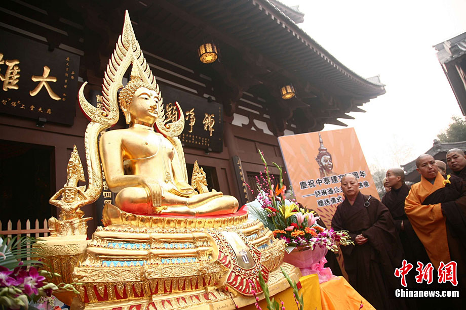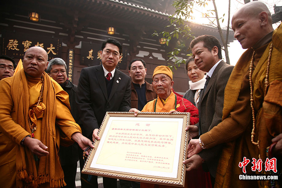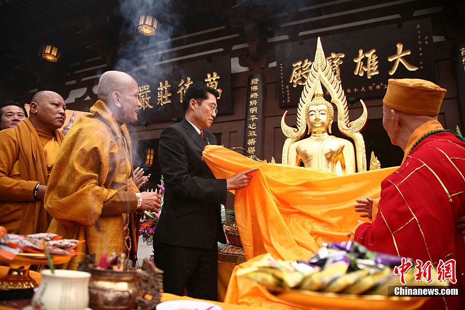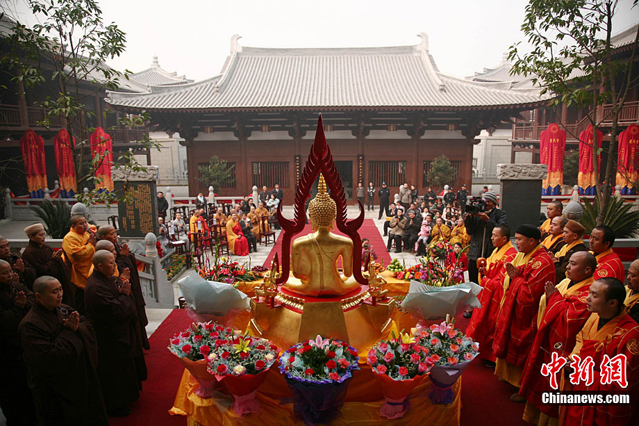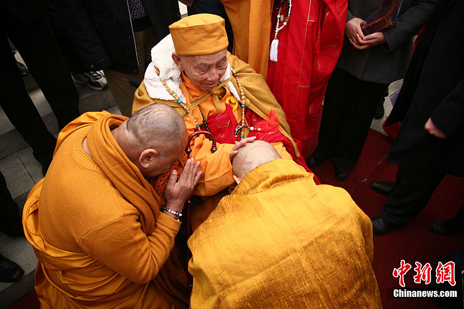 12月22日,两位泰国僧人在四川成都应天寺接受该寺庙107岁长老佛智的“摸顶”礼仪,“摸顶”是佛教中的一种重要礼仪,有表示“慈悲、呵护”之意。当日,“泰国诗琳通公主赠送佛像”仪式在该寺庙举行。泰国公主诗琳通此次赠送的泰国素可泰式法拓沁那拉佛(释迦牟尼佛)共8尊,全身为黄铜铸造,表面贴金,于2010年10月3日在泰国曼谷铸造而成,铸佛仪式由泰国副僧王主持。这8尊佛像将通过四川省佛教协会转送给成都应天寺、峨眉山寺庙、成都大慈寺、北川龙吟寺等八座寺庙。中新社发 张浪 摄