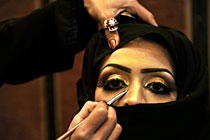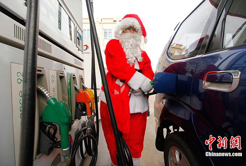 12月23日,印度尼西亚坦格朗市的一座加油站内,工作人员身着圣诞老人的服装,为过往车辆加油、洗车。