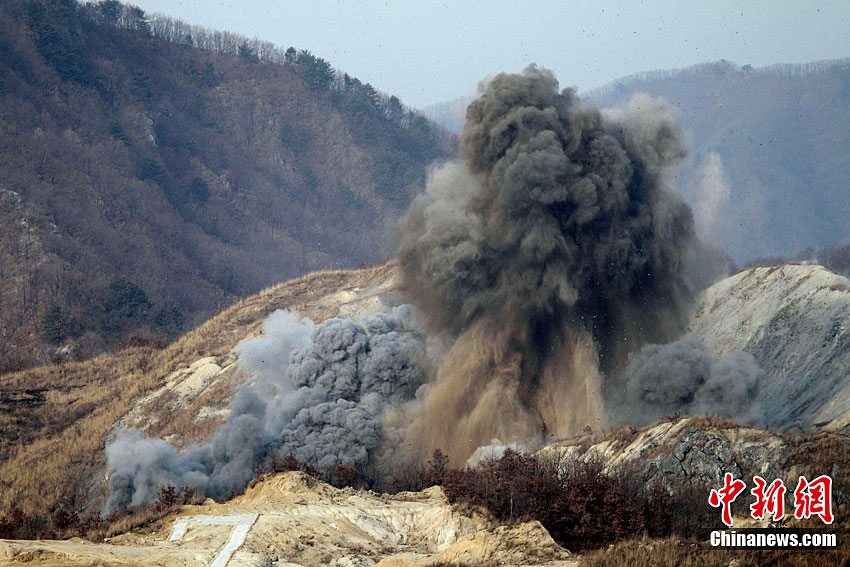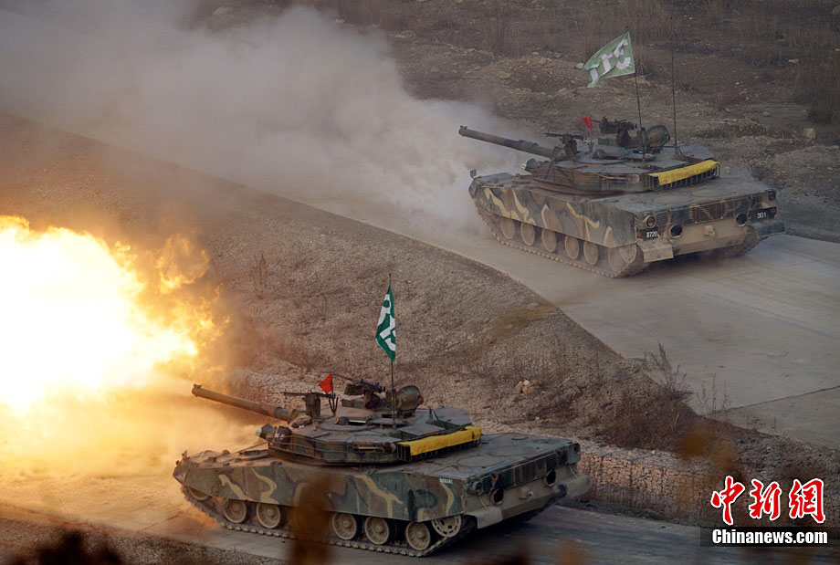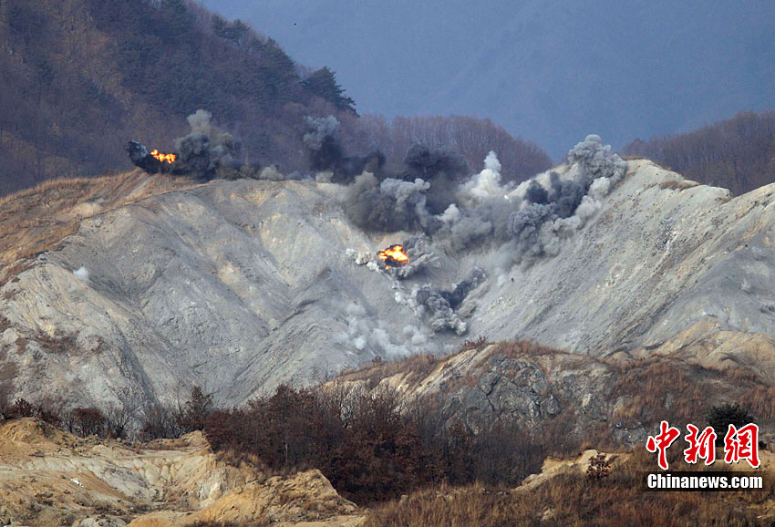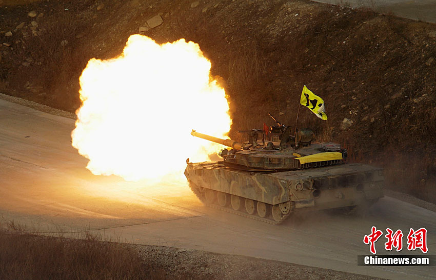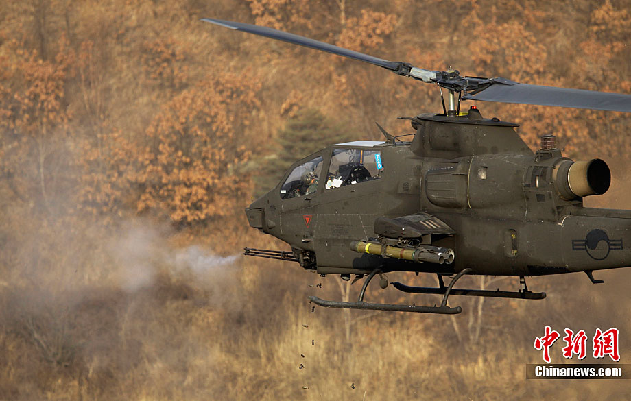 当地时间12月23日下午2时43分,韩国军方最大规模的陆空联合实弹射击演练开始。据悉,此次演习投入800名官兵,动员6架F-15K和KF-16战斗机、K-1战车、AH-1S攻击型直升机、K-9自走炮、反战车导弹和多管火箭发射系统等105种火力装备。图为AH-1S攻击型直升机在进行射击。