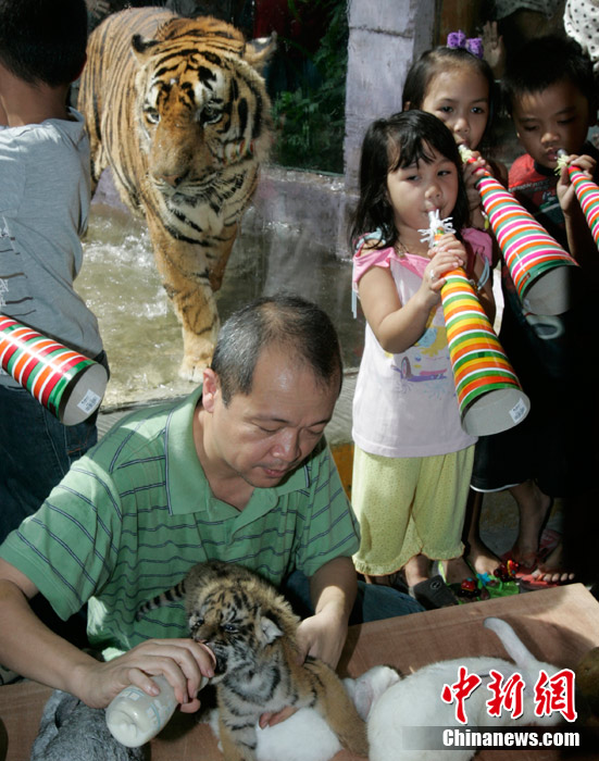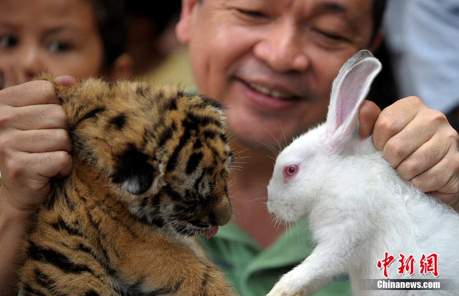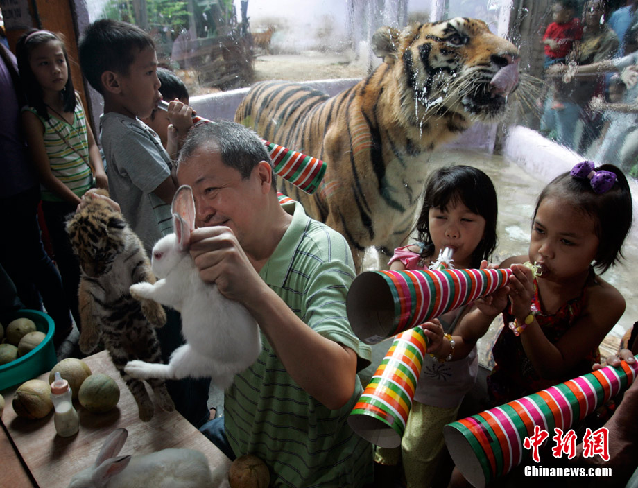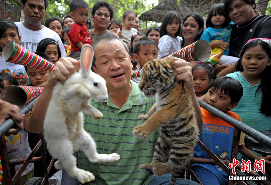 12月28日,菲律宾首都马尼拉北部的马拉邦动物园,一名工作人员抓起老虎幼崽和兔子向游客展示。许多亚洲国家都有庆祝农历新年的习俗,人们即将告别虎年,迎来兔年。