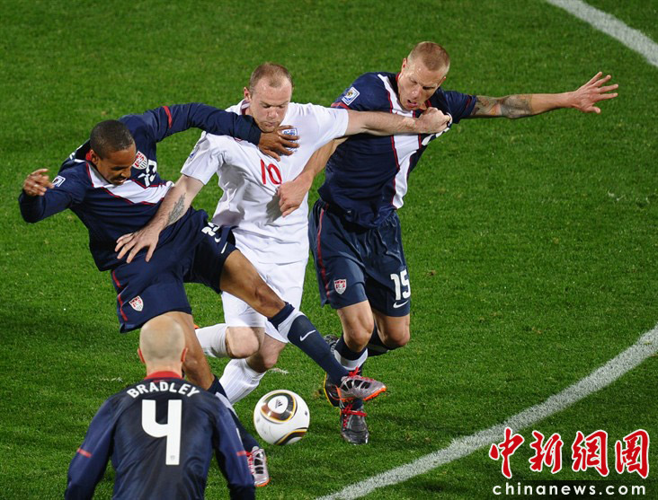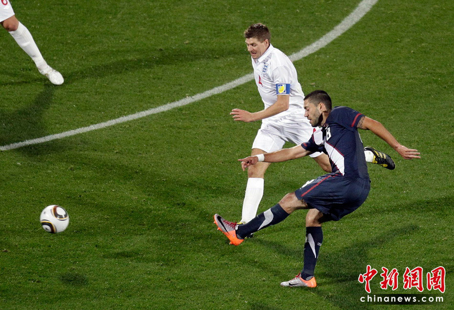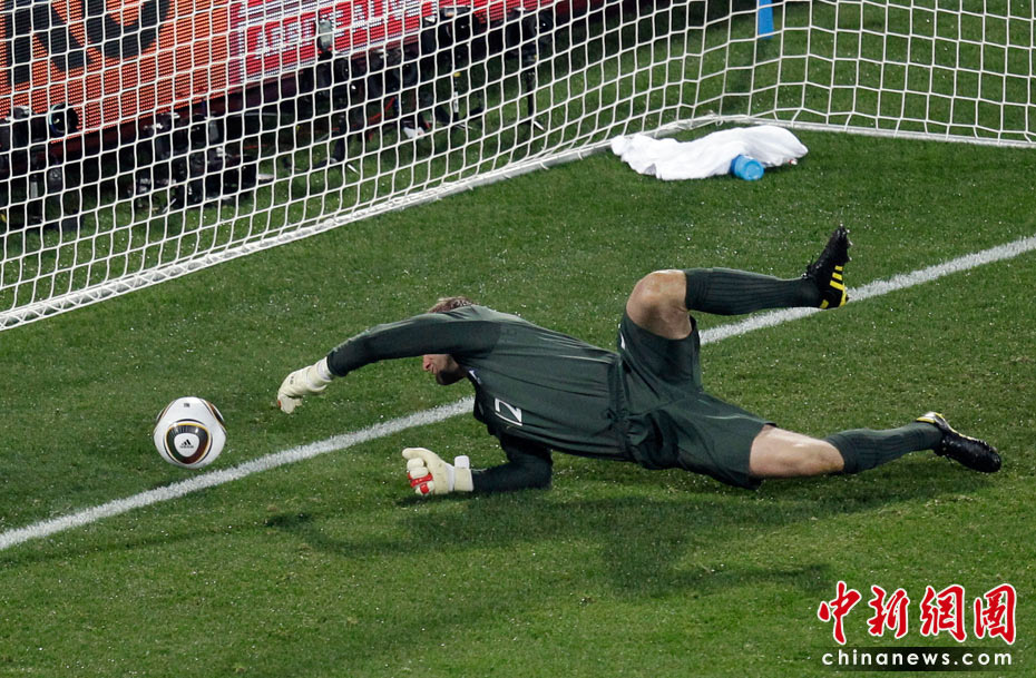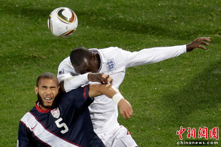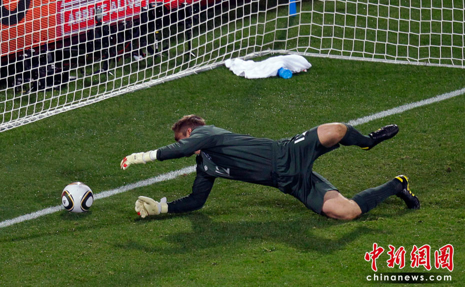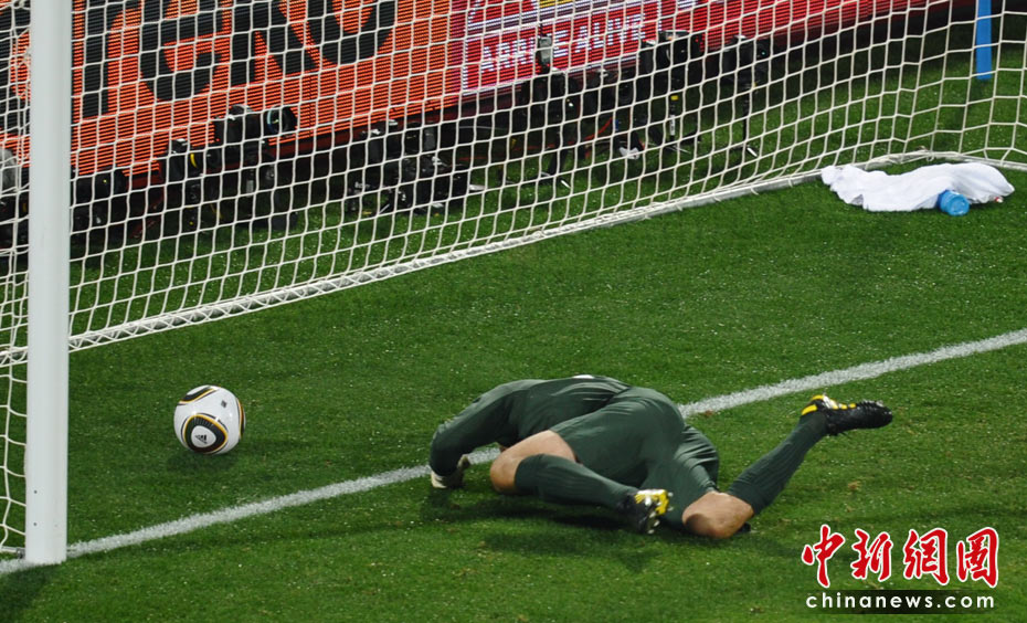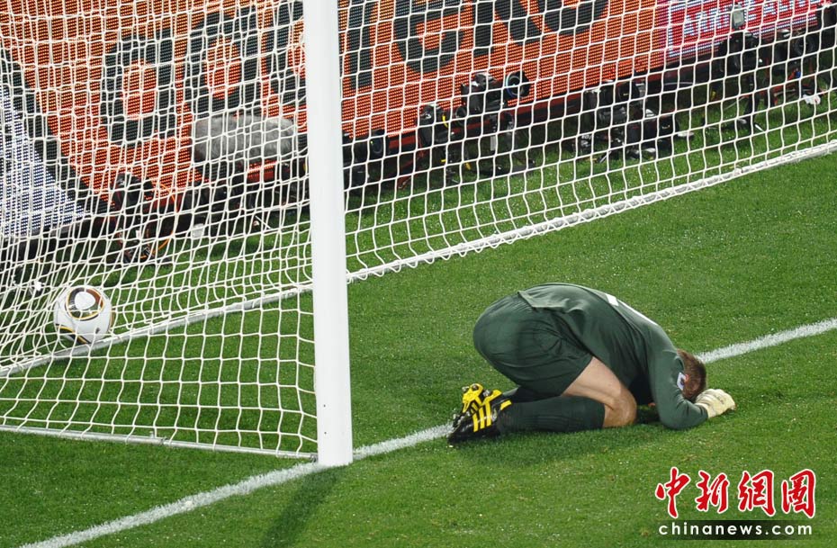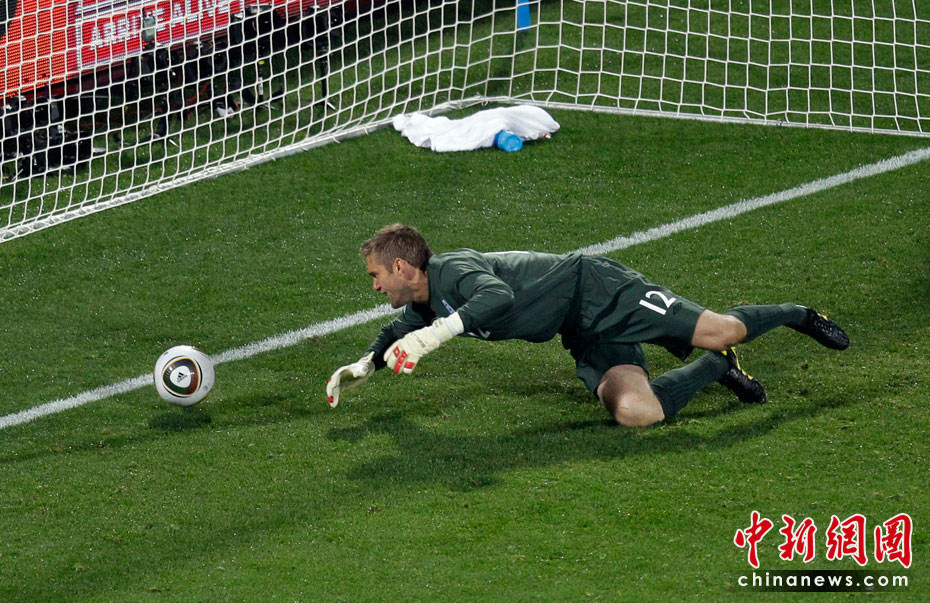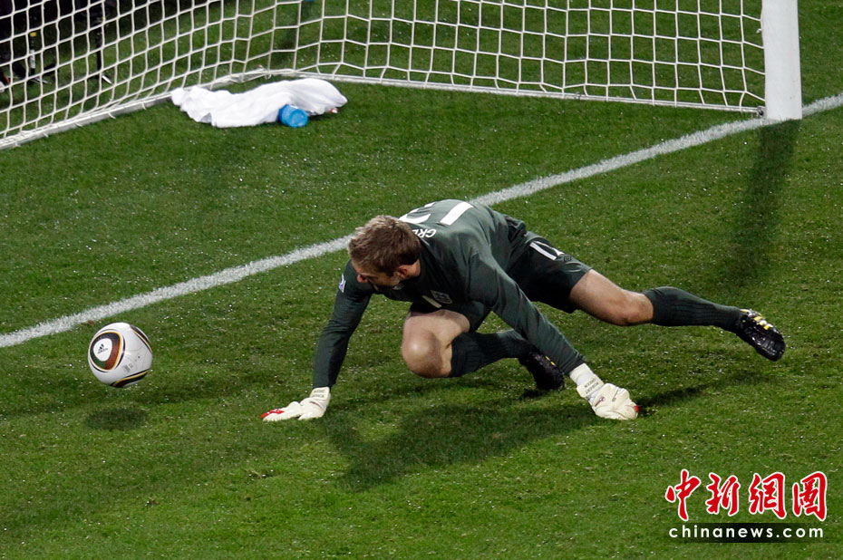 在13日凌晨2:30开始的一场南非世界杯小组赛中,英格兰队迎来了首个对手美国队,虽然兰帕德在比赛开始后先拔头筹,但上半场临近结束前守门员格林的一次超低级失误断送好局,最终双方1-1握手言和。 图为格林失误的瞬间。