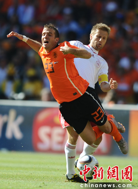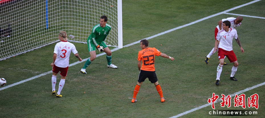 北京时间6月14日晚19点30分,南非世界杯E组第一轮正式在约翰内斯堡的足球城体育场打响,由橙衣军团荷兰队对阵“北欧海盗”丹麦队。下半场丹麦后卫鲍尔森打进本届世界杯的第一粒乌龙球。84分钟库伊特门前捡漏得手,为荷兰队锁定胜局,橙衣军团2-0战胜丹麦。