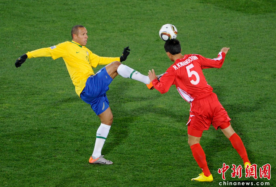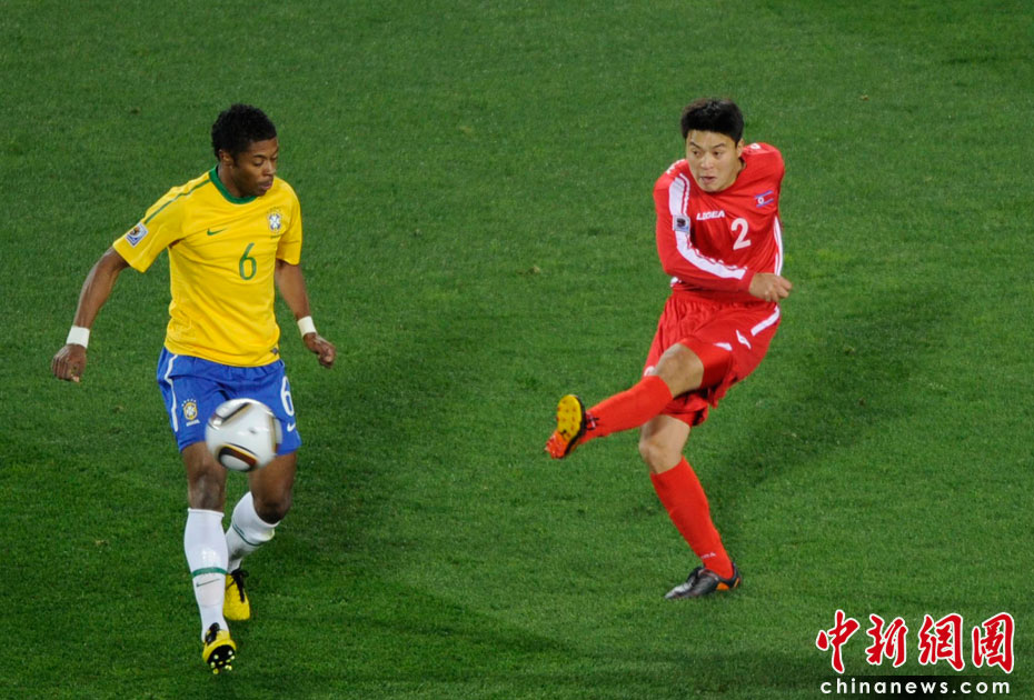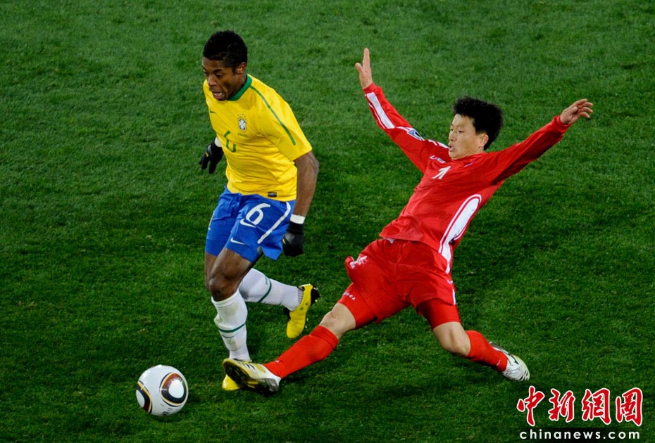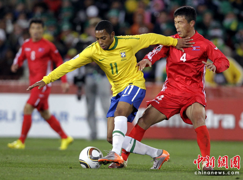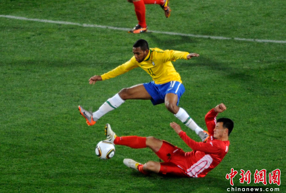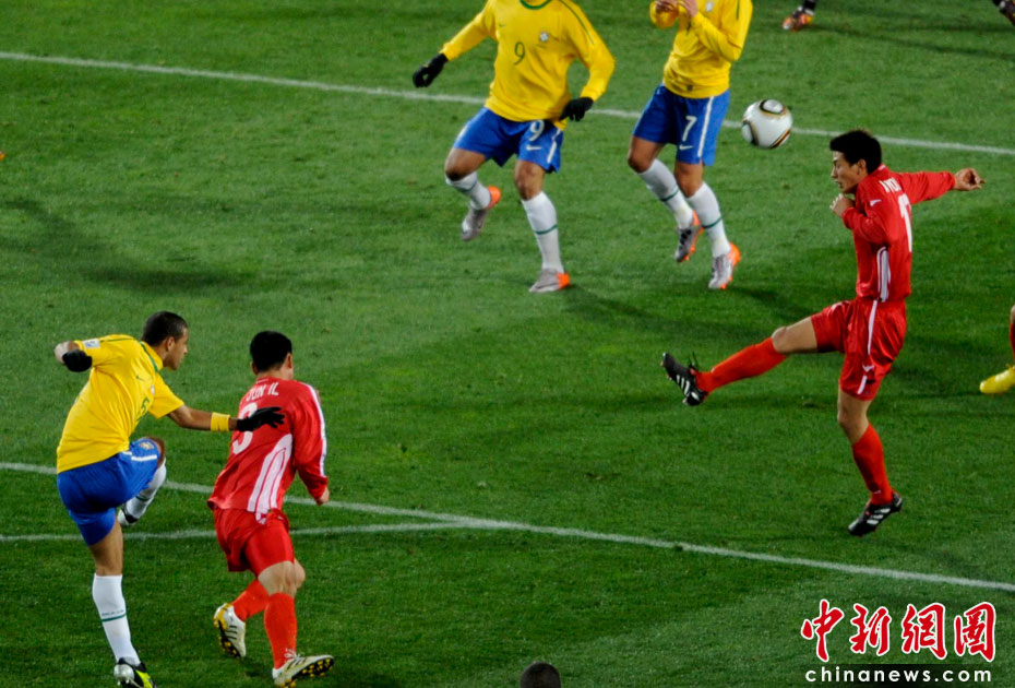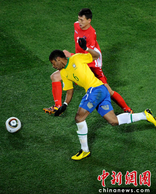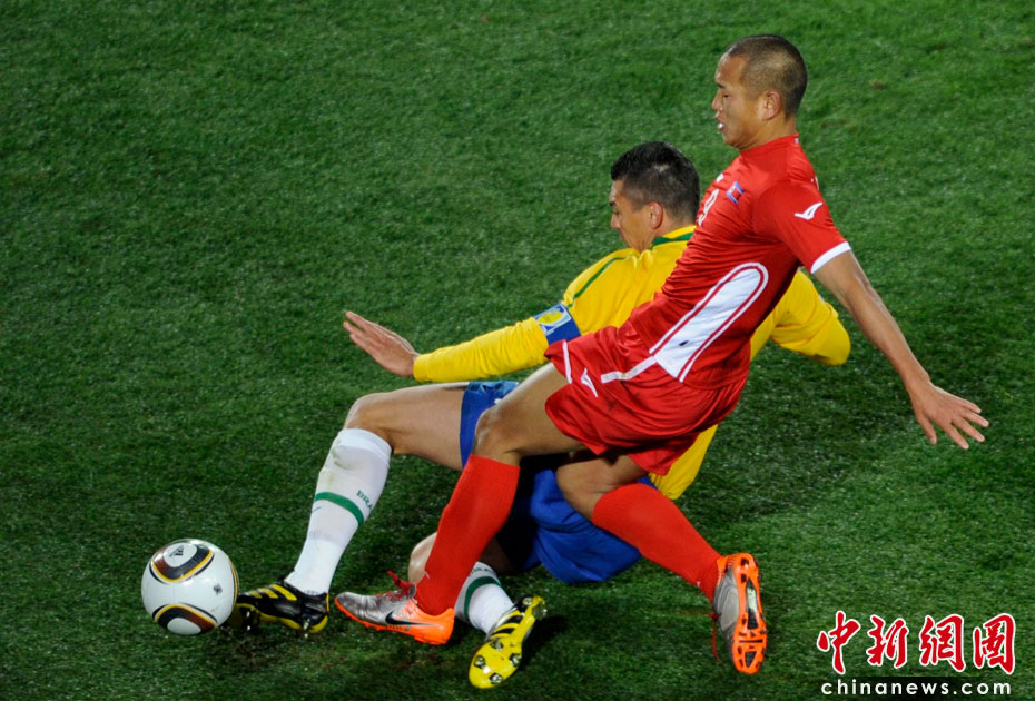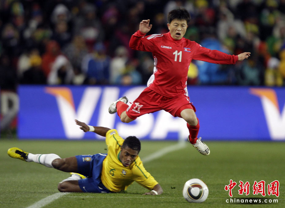 北京时间6月16日凌晨2:30进行的一场世界杯小组赛G组的较量中,巴西队迎来了朝鲜队。最终经过90分钟激战,巴西队2-1击败朝鲜,赢得南非世界杯开门红。中新社记者 廖攀 摄