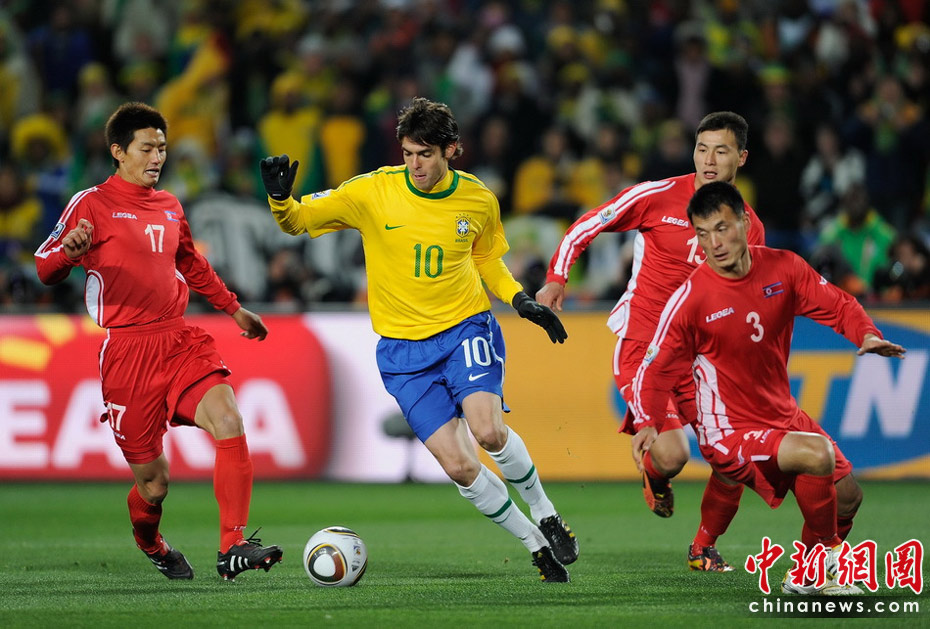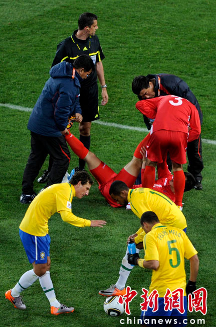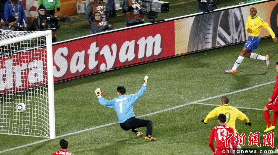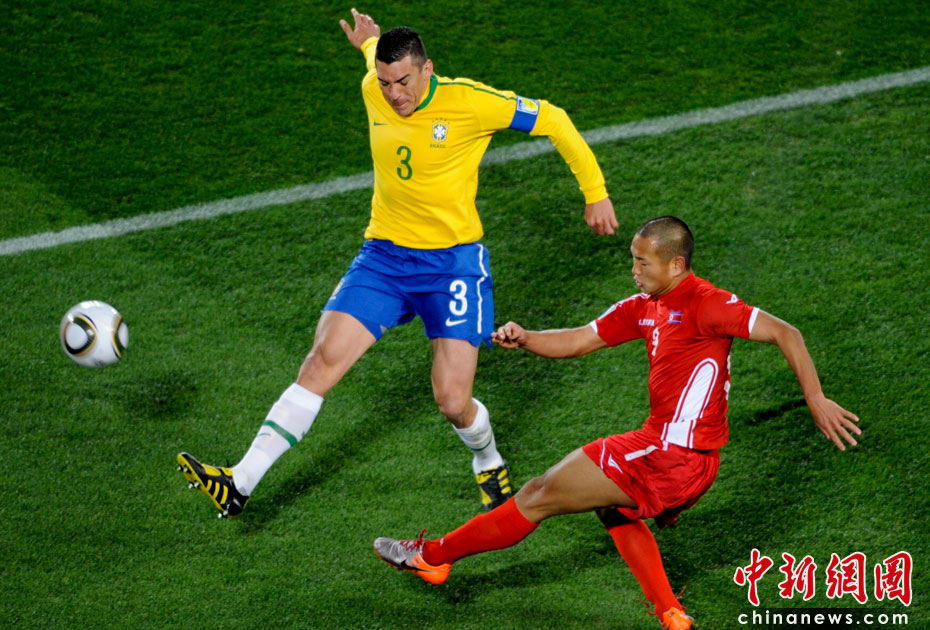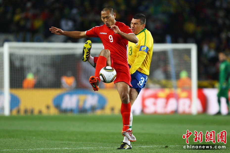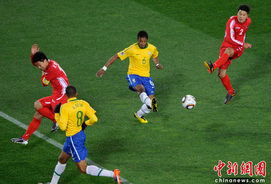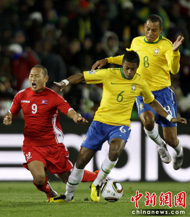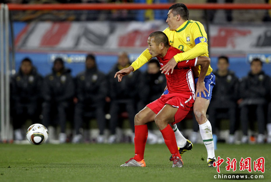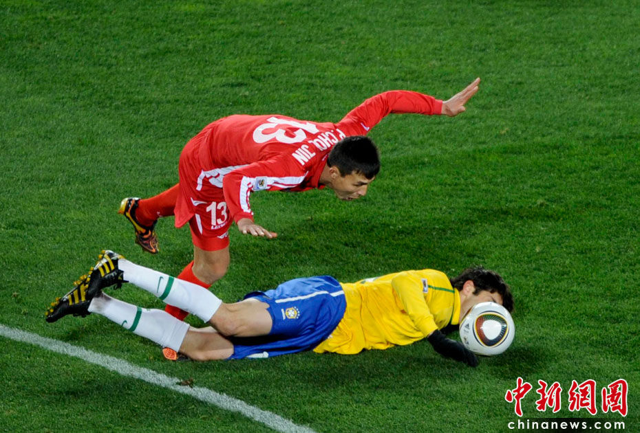 北京时间6月16日凌晨2:30进行的一场世界杯小组赛G组的较量中,巴西队迎来了朝鲜队。最终经过90分钟激战,巴西队2-1击败朝鲜,赢得南非世界杯开门红。中新社记者 廖攀 摄