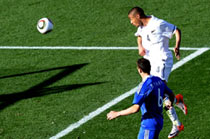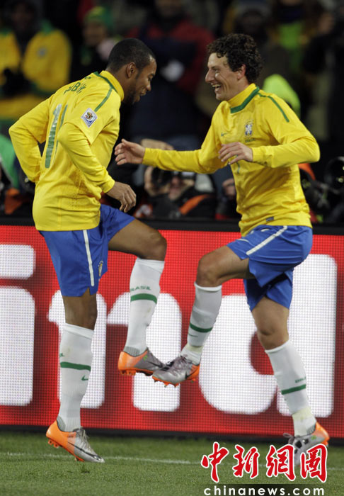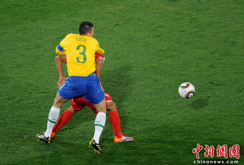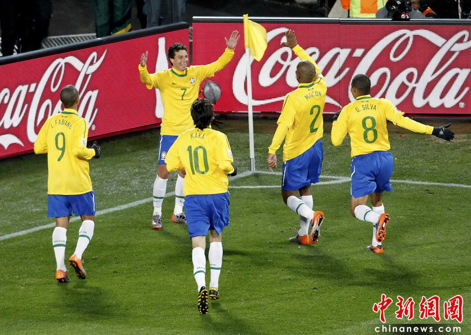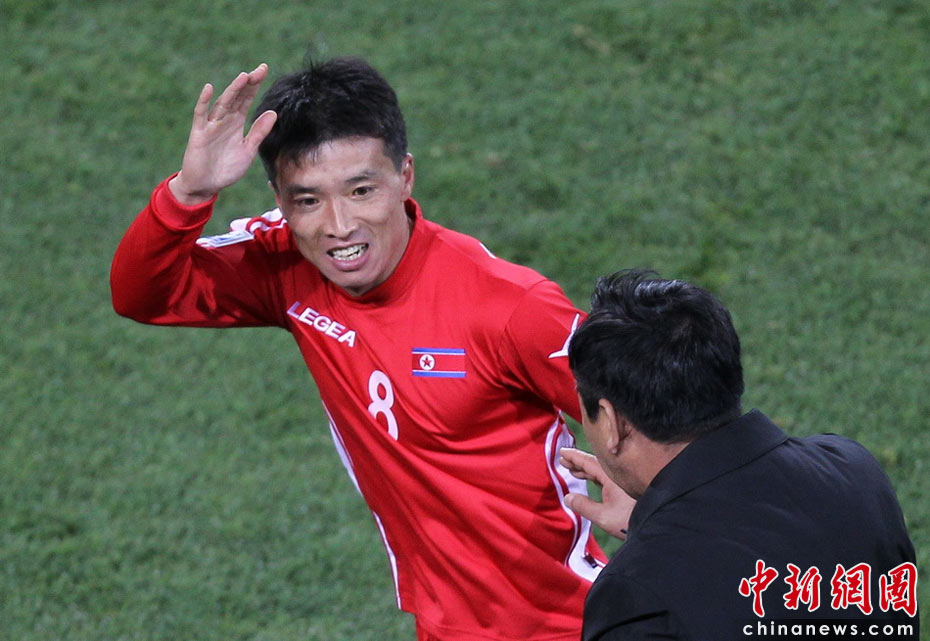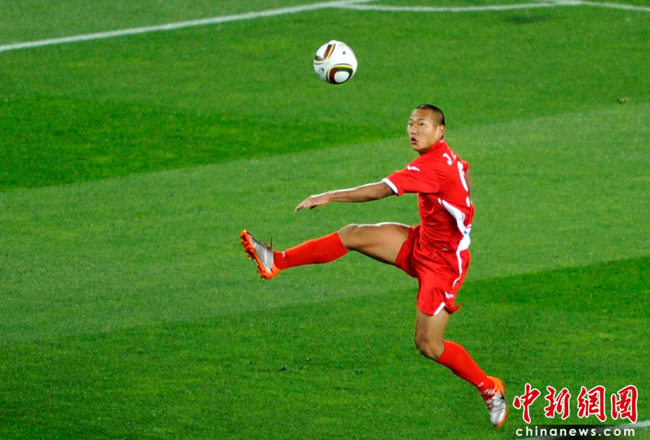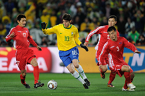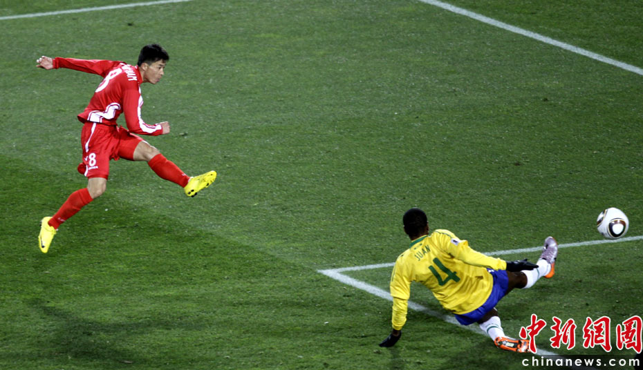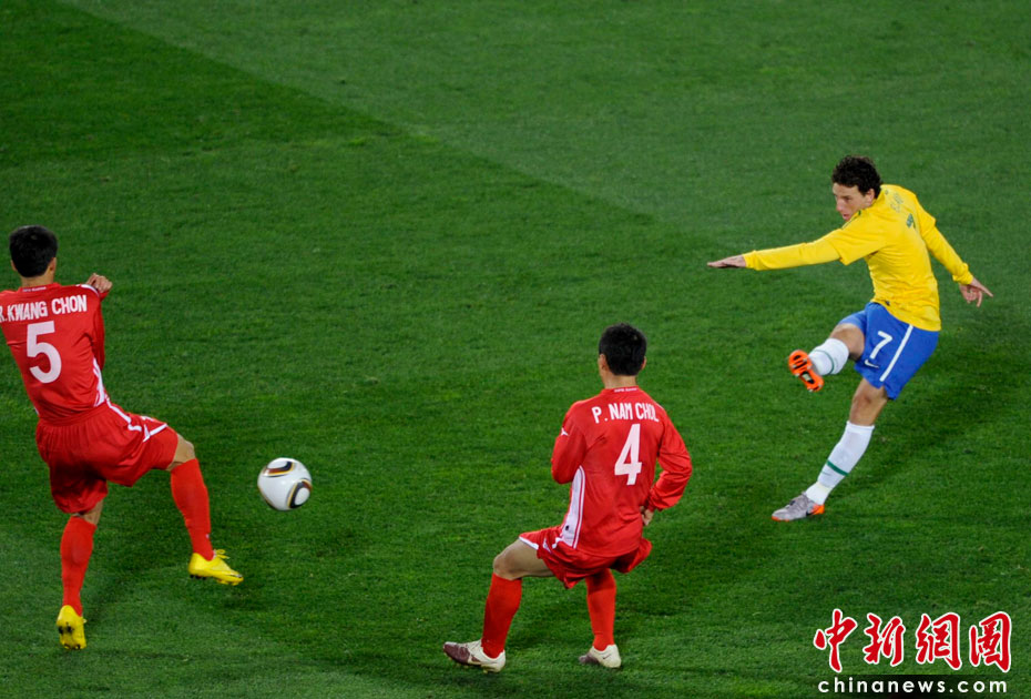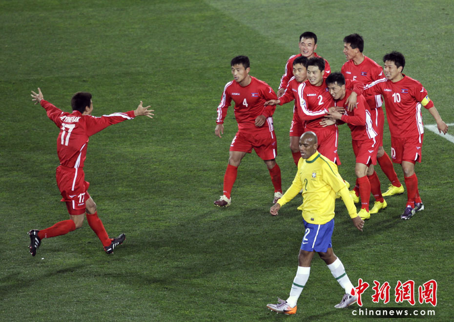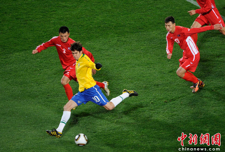 北京时间6月16日凌晨2:30进行的一场世界杯小组赛G组的较量中,巴西队迎来了朝鲜队。最终经过90分钟激战,巴西队2-1击败朝鲜,赢得南非世界杯开门红。中新社记者 廖攀 摄