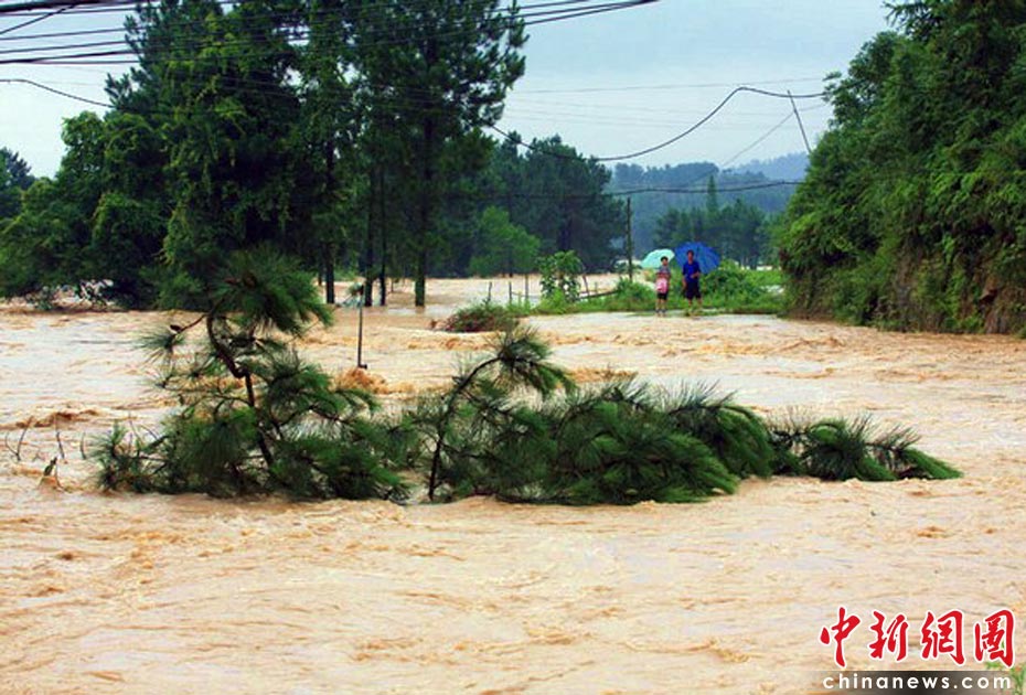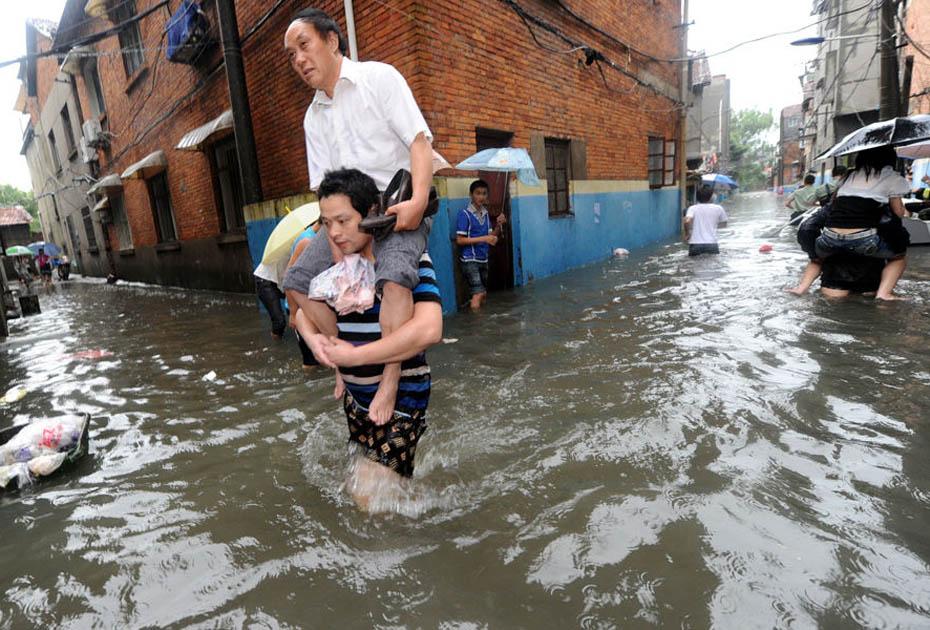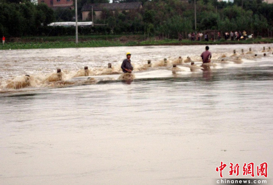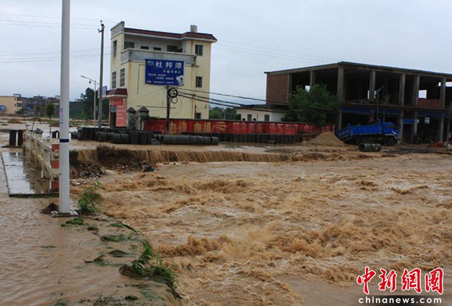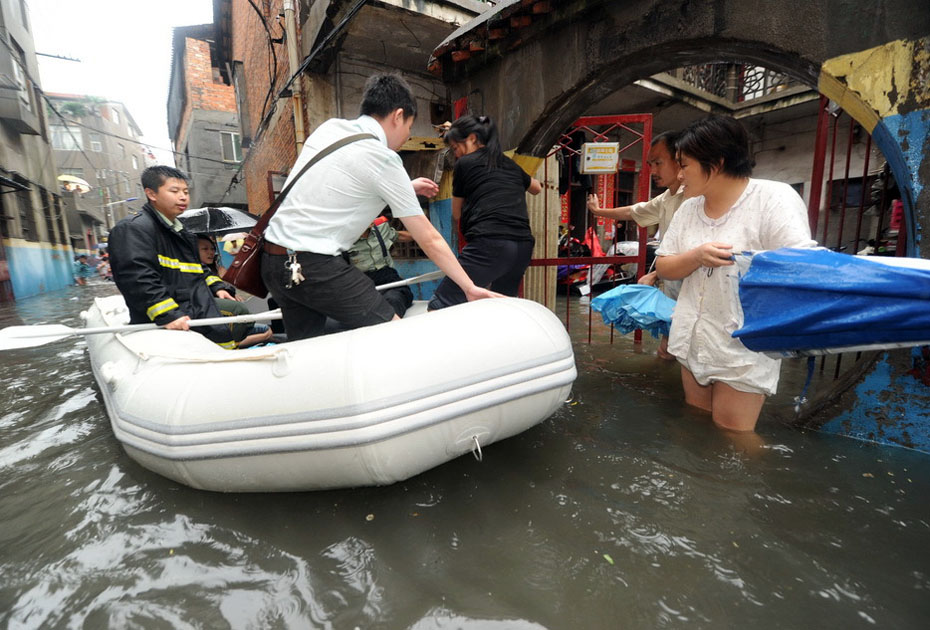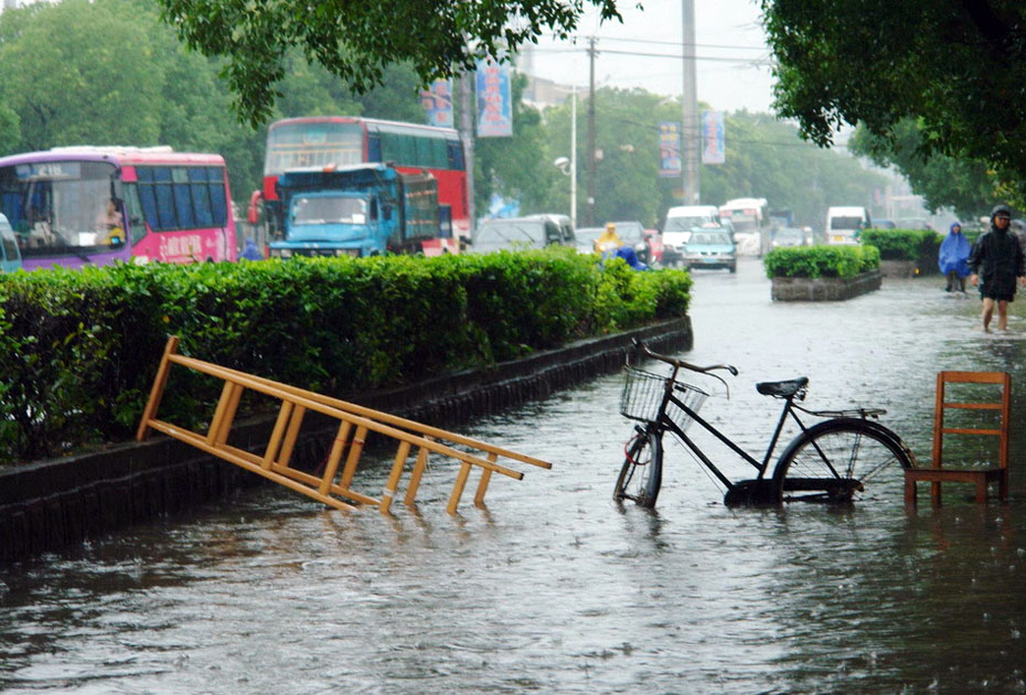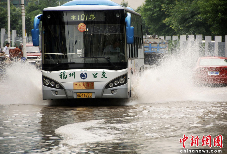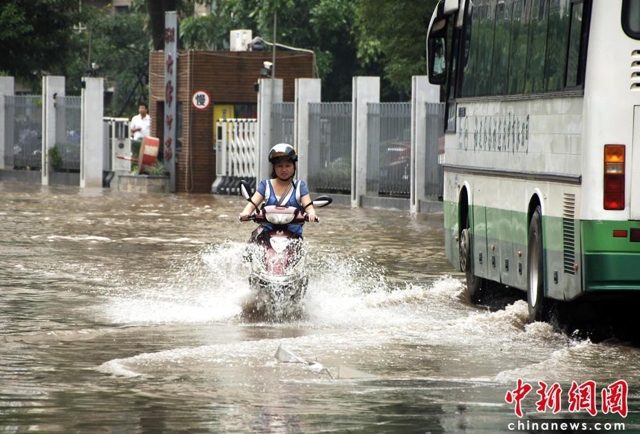 6月19日,福州一市民在市区被淹的道路艰难骑行。连日暴雨侵袭,福建各地水灾不断,已导致165万人受灾。中新社发 王东明 摄