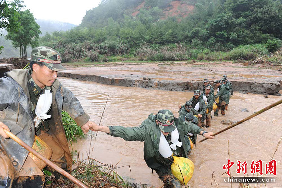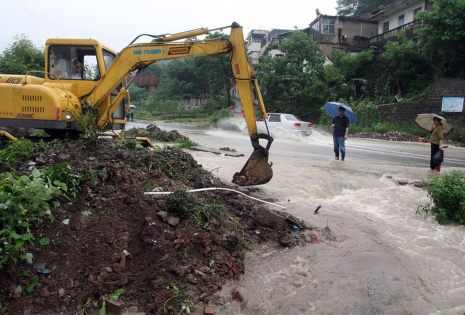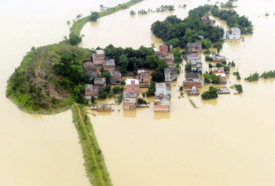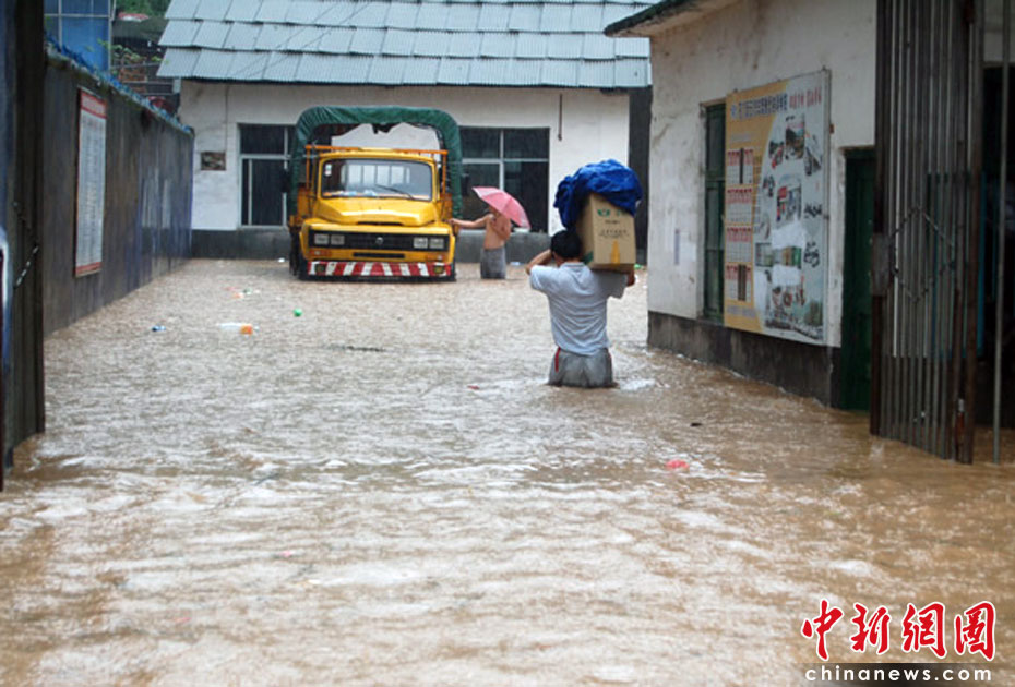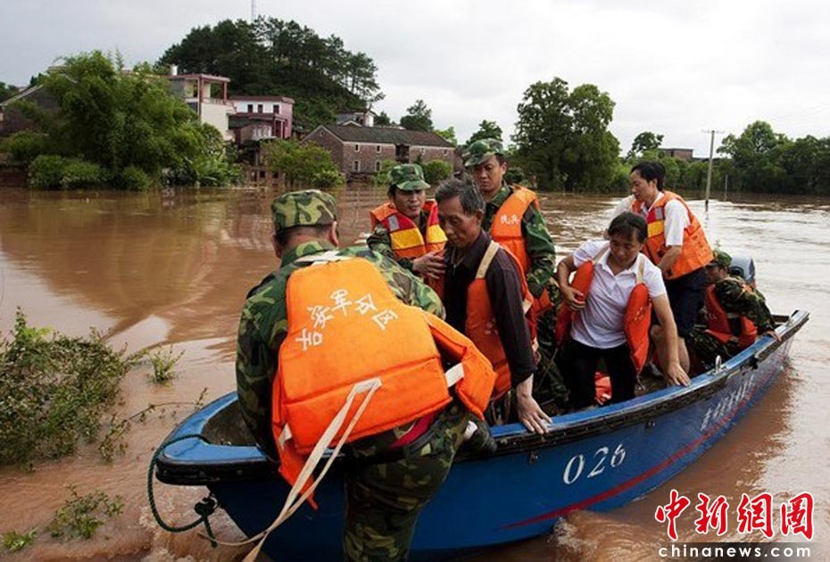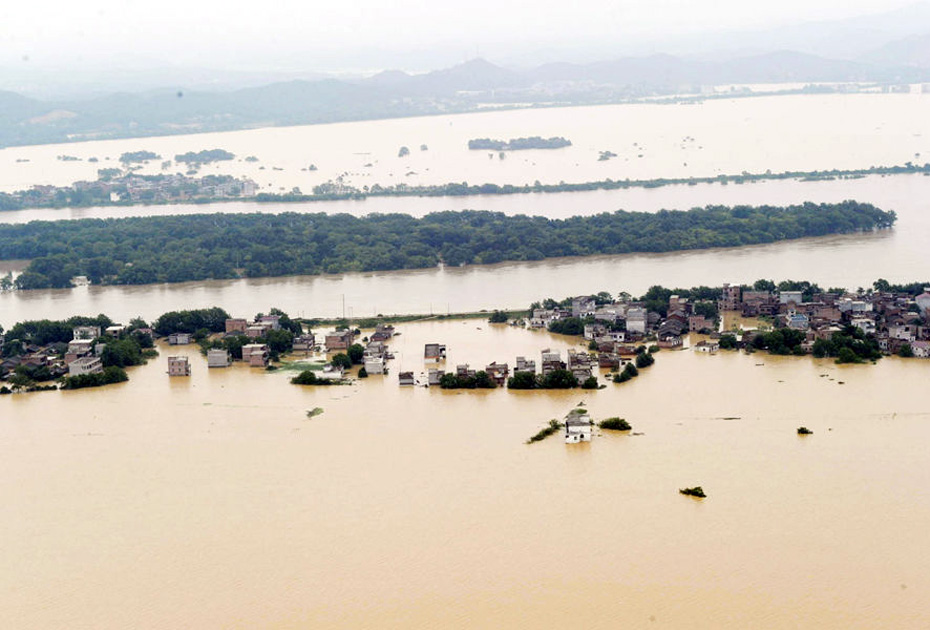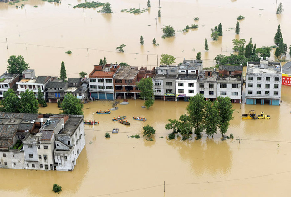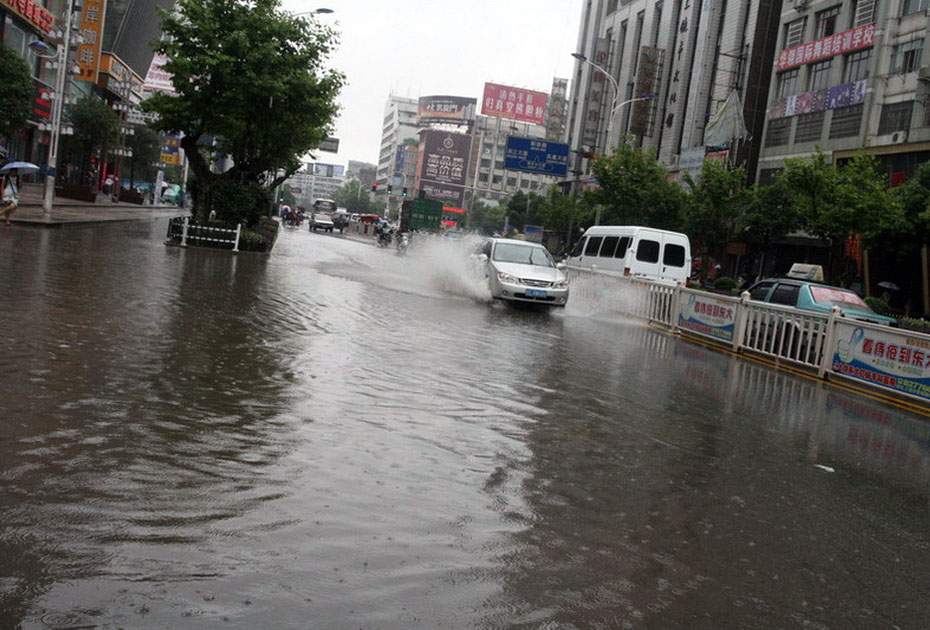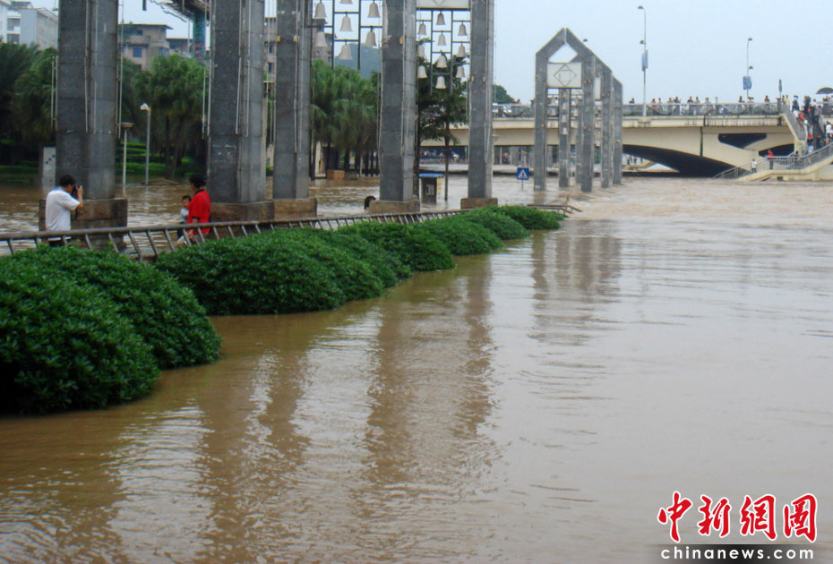 6月19日,福州一市民在市区被淹的道路艰难骑行。连日暴雨侵袭,福建各地水灾不断,已导致165万人受灾。中新社发 王东明 摄