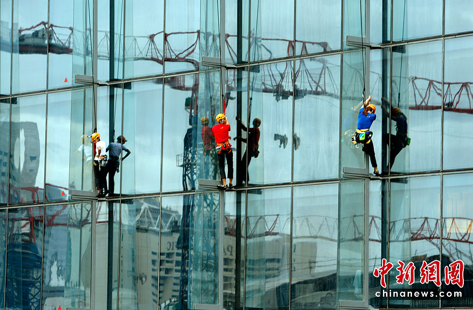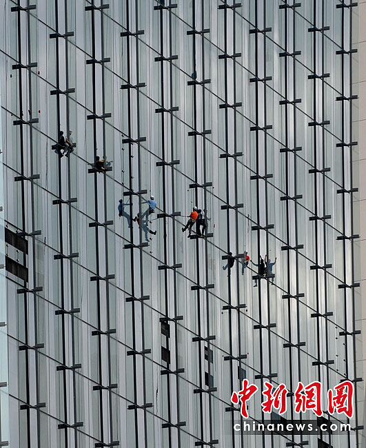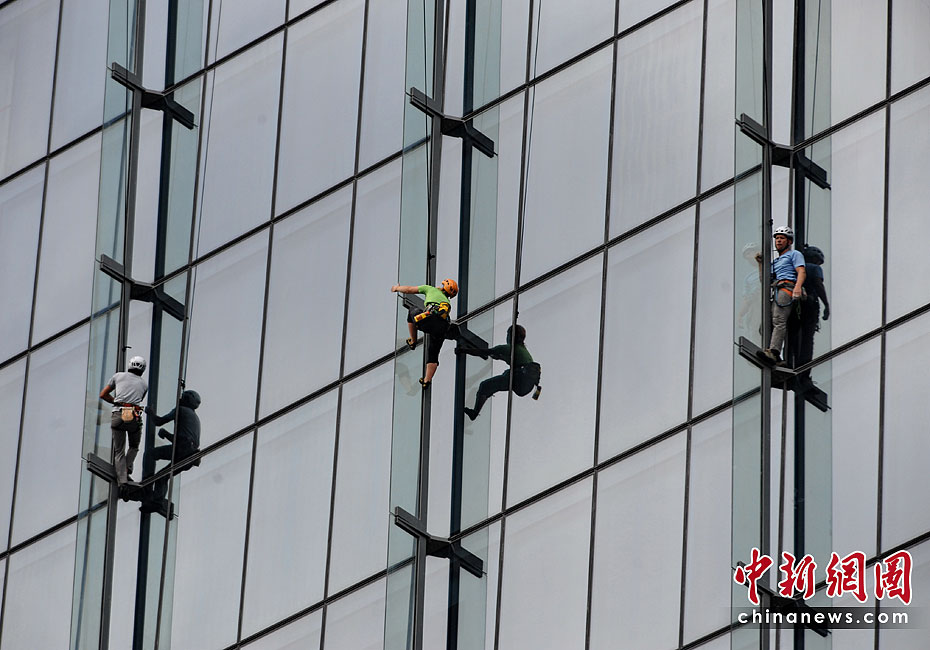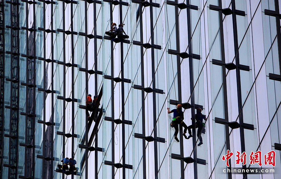 当地时间6月23日,21名专业登山者参加了在新加坡举行的首届世界攀登高塔锦标赛。21位专业登山者同时攀爬3座55层楼高的滨海湾金沙酒店,最先爬到楼顶者为胜。