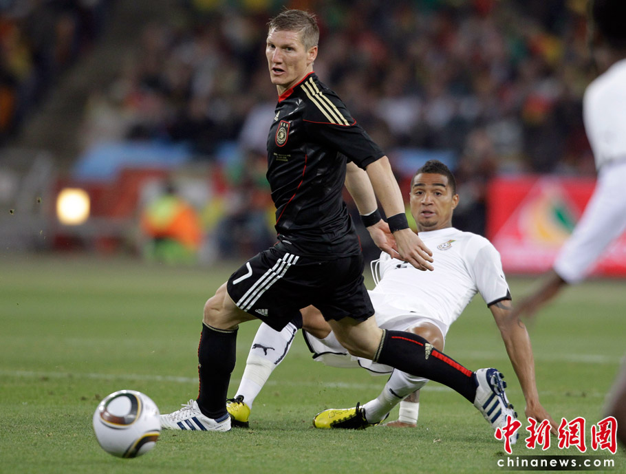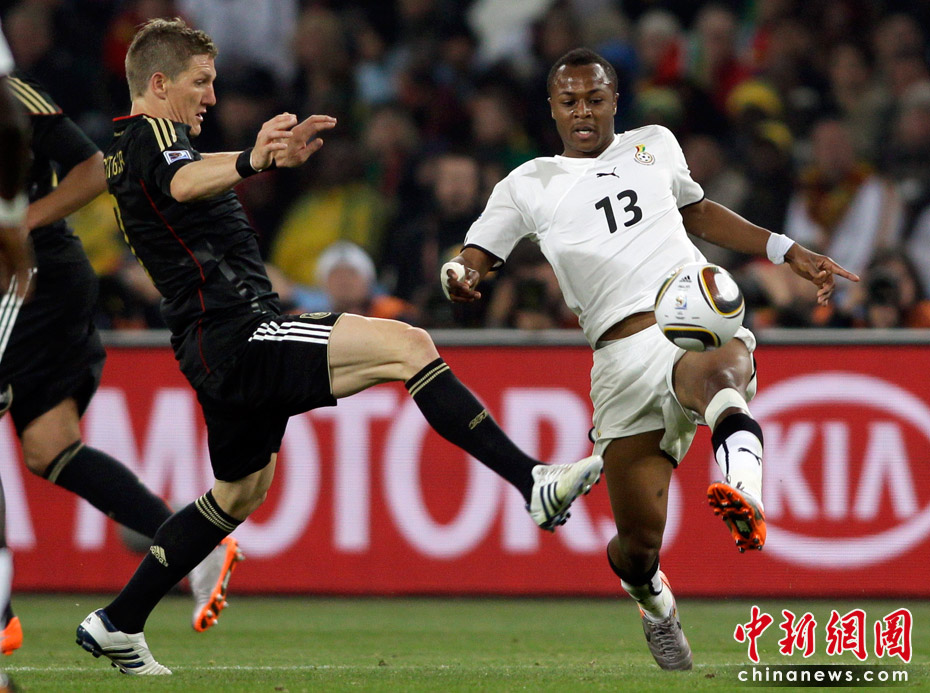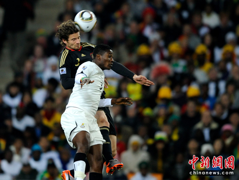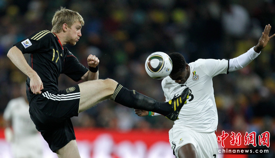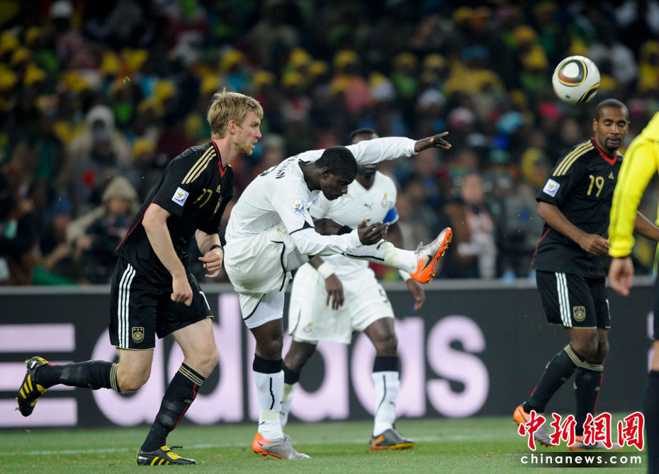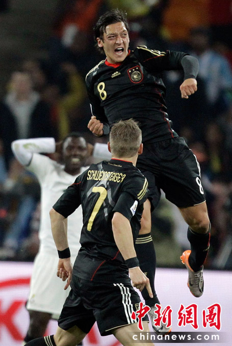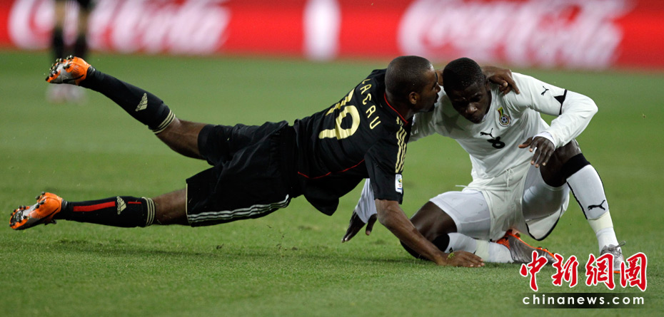 北京时间24日凌晨,世界杯小组赛D组迎来“决战之夜”。欧洲劲旅德国队在约翰内斯堡足球城体育场迎战加纳队。最终,凭借着中场球员厄齐尔的制胜一球,德国队1比0击败加纳队,两队携手进军16强。德国队三战2胜1负排名小组第一,他们在1/8决赛的对手将是老冤家英格兰队。加纳队小组第二出线,将与美国队争夺一个八强席位。中新社记者 廖攀 摄