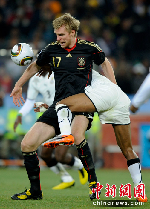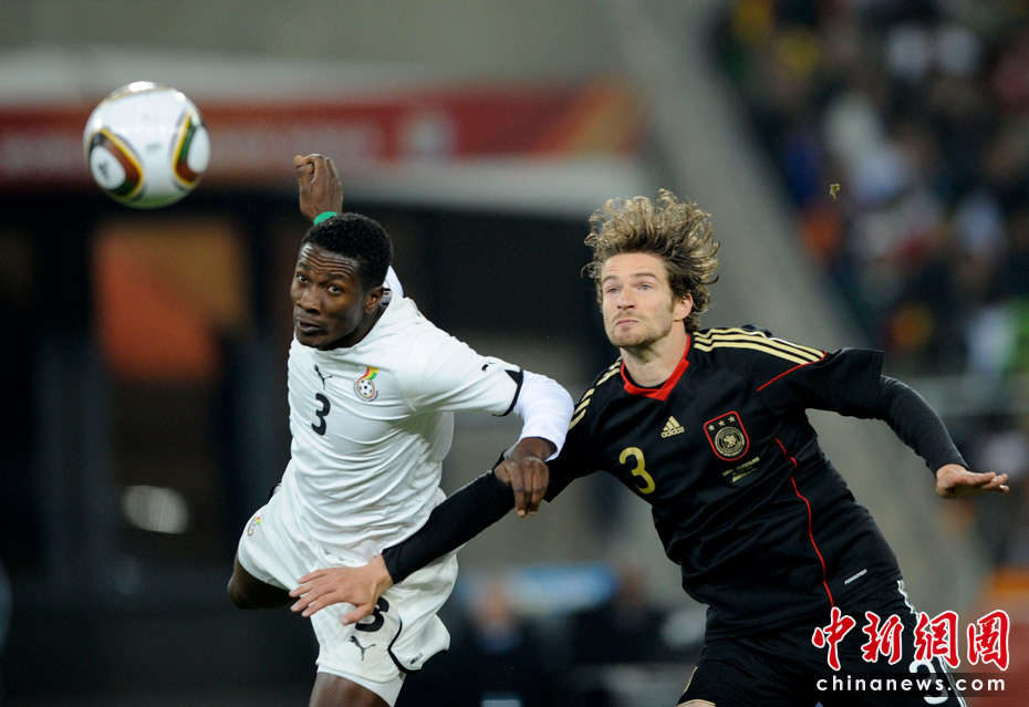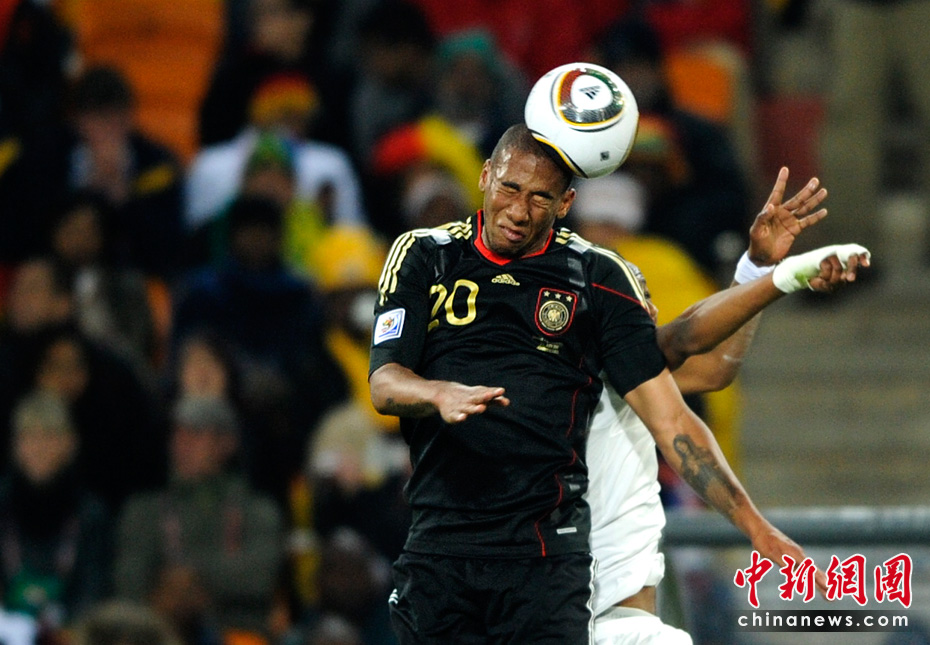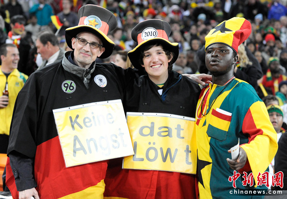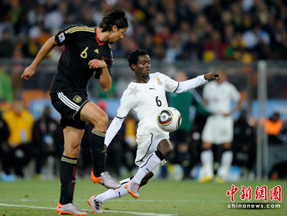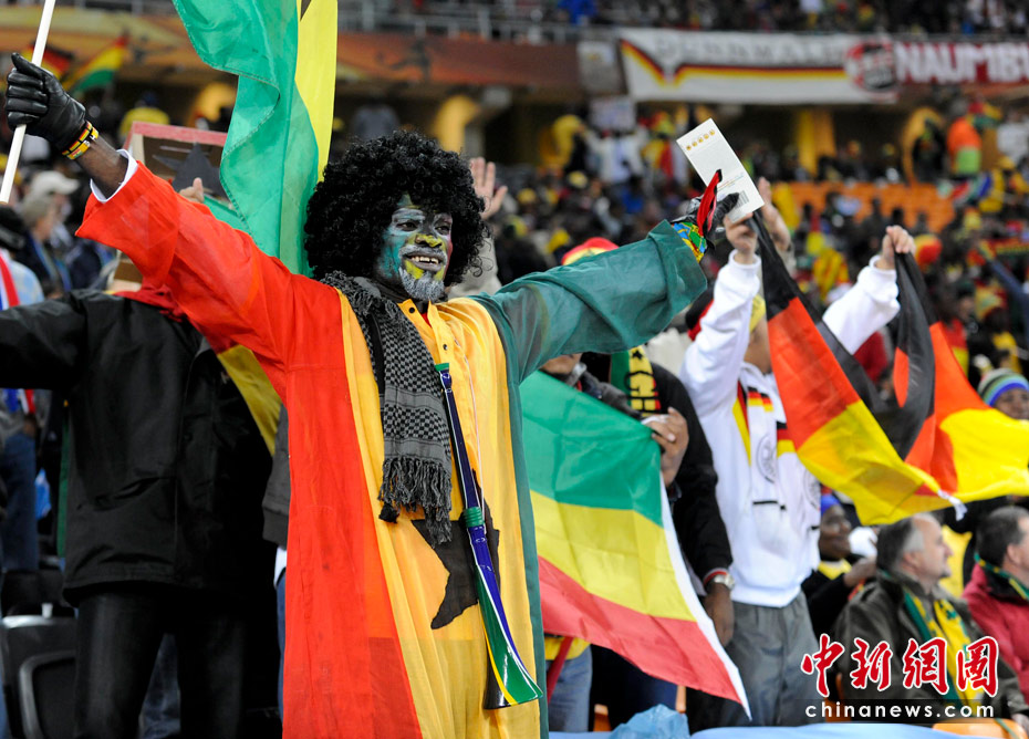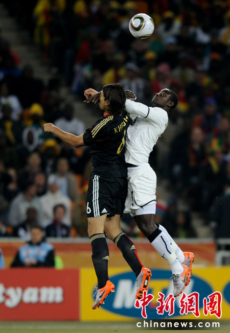 北京时间24日凌晨,世界杯小组赛D组迎来“决战之夜”。欧洲劲旅德国队在约翰内斯堡足球城体育场迎战加纳队。最终,凭借着中场球员厄齐尔的制胜一球,德国队1比0击败加纳队,两队携手进军16强。德国队三战2胜1负排名小组第一,他们在1/8决赛的对手将是老冤家英格兰队。加纳队小组第二出线,将与美国队争夺一个八强席位。中新社记者 廖攀 摄
