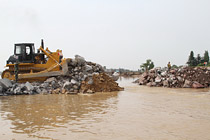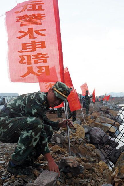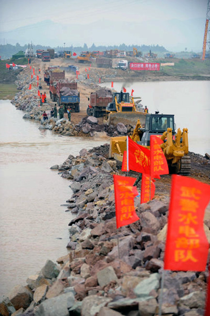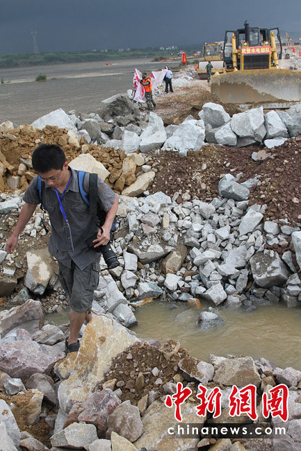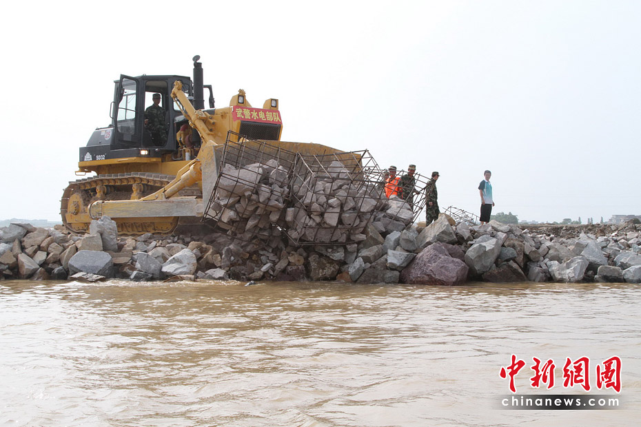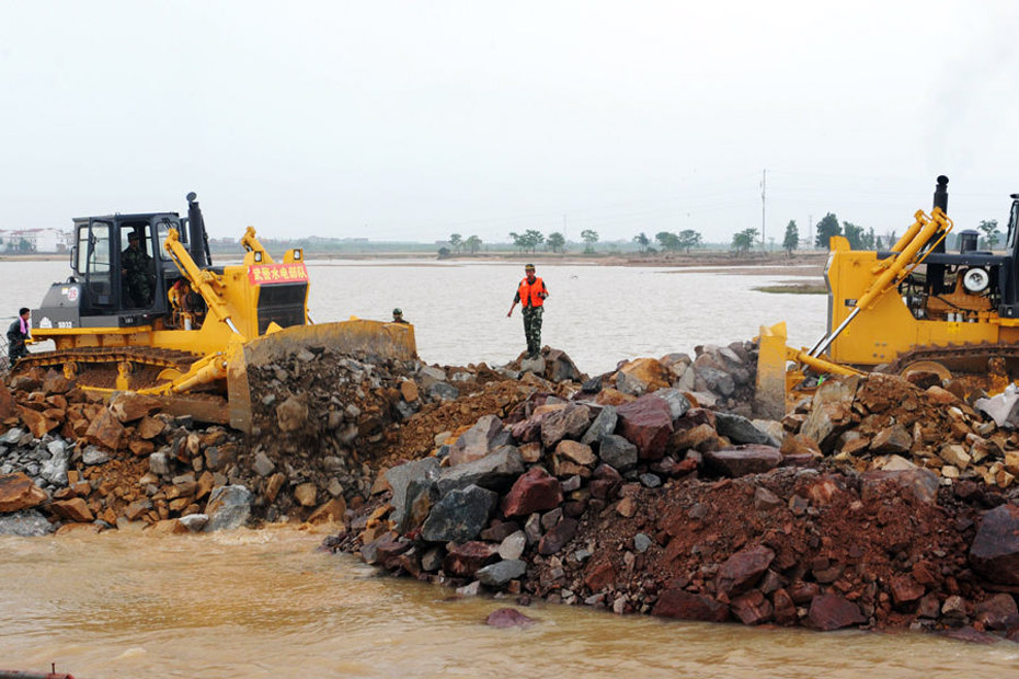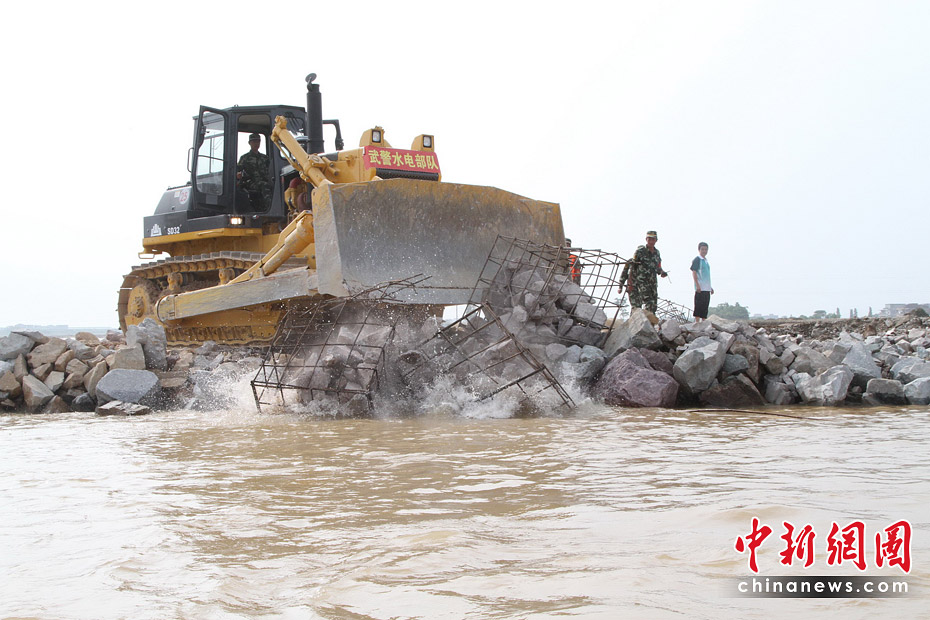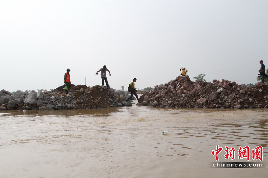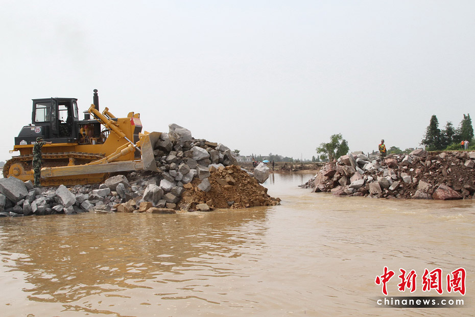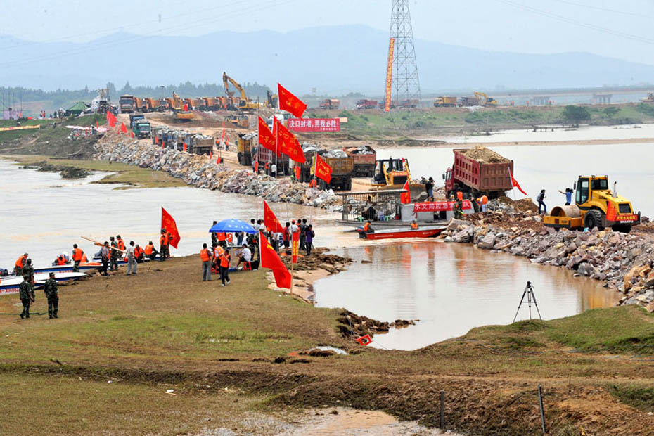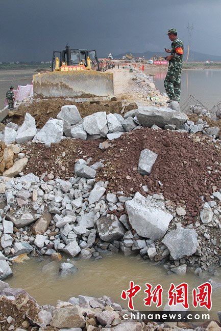 随着最后一车土石投入河道,决口6天的江西抚州唱凯大堤终于合龙,恢复了它完整的堤身。原计划6天完成的决口封堵任务提前3天完成。图片来源:新华网 章武 摄
