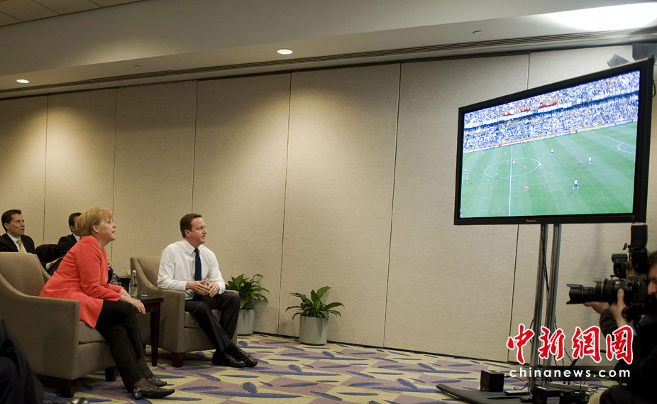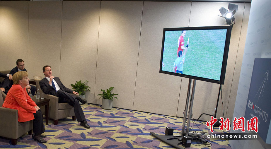 6月27日,正在加拿大参加G20领导人峰会的德国总理默克尔和英国首相卡梅伦,一同观看了世界杯英格兰与德国队的比赛。