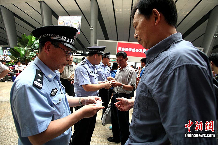 6月30日,警方在北京南站查验进站旅客的车票及身份证。当日,京沪高铁开通。中新社发 苏丹 摄
