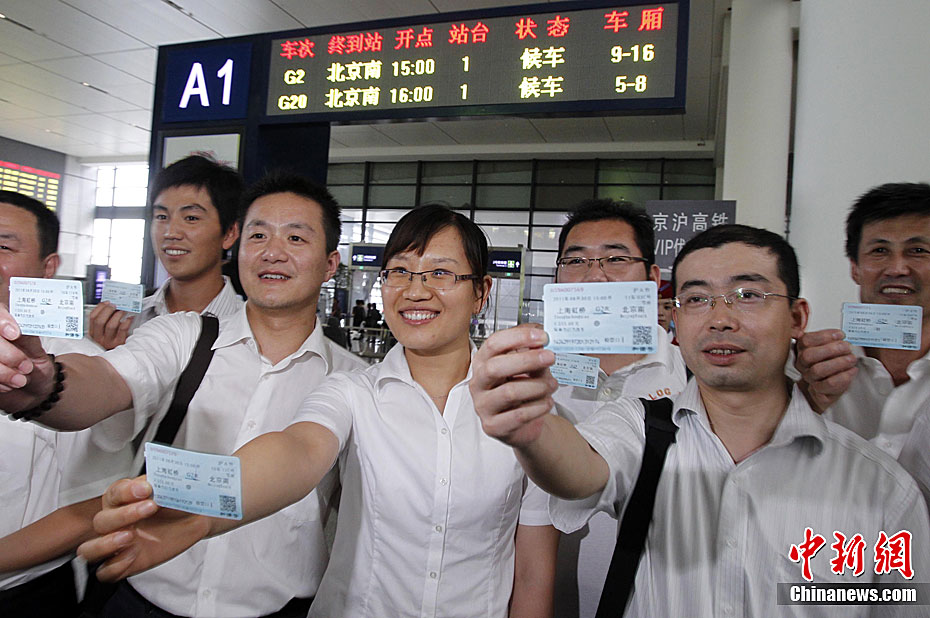 6月30日15时,备受关注的京沪高铁正式开通运营,“头班车”吸引了众多旅客前来体验。作为新中国成立以来一次建设里程最长、投资最大、标准最高的高速铁路,京沪高铁贯通“三市四省”,串起京沪“经济走廊”。时速300公里动车组列车从北京到上海最短旅行时间仅需4小时48分。京沪高铁于2008年4月开工,总长度1318公里,总投资约2209亿元。京沪高铁票价最低410元,最高1750元。中新社发 汤彦俊 摄