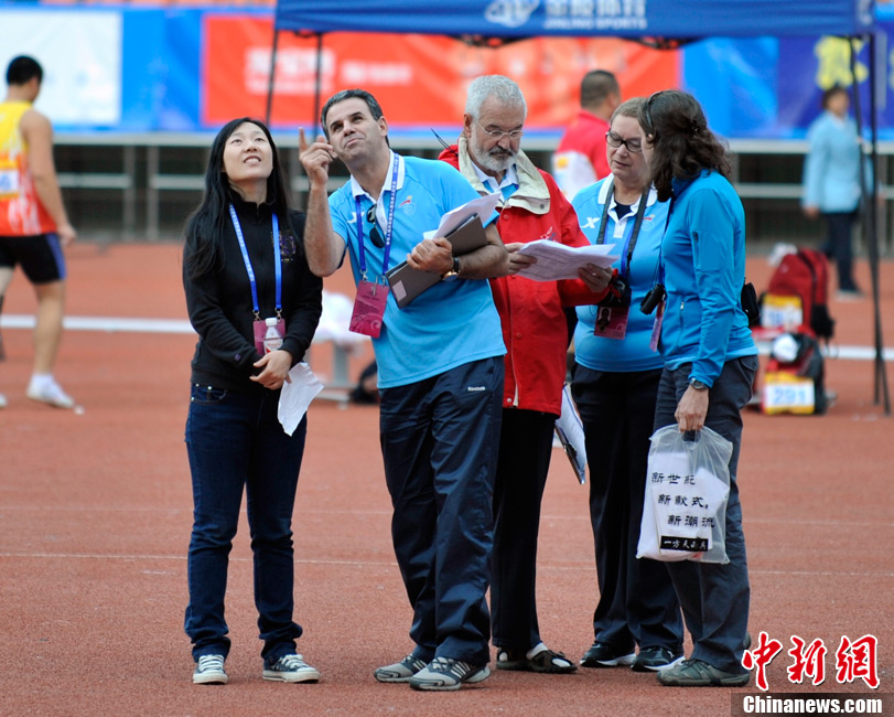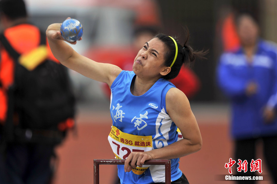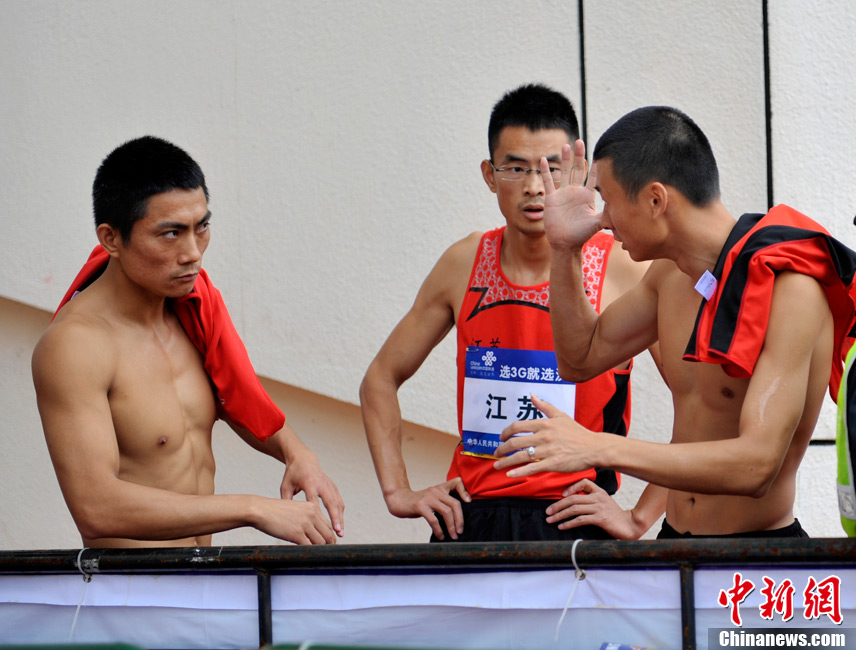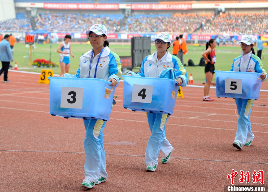 10月14日,第八届全国残疾人运动会进入开幕以来的第三个比赛日。当日,田径赛场经过激烈的角逐,共产生了54枚金牌。在男子5000米T45/46组的比赛中,浙江一队选手李朝燕以15分26秒23的成绩摘金。图为来自浙江一队的李朝燕在比赛中(右一)。中新社发 金硕 摄
