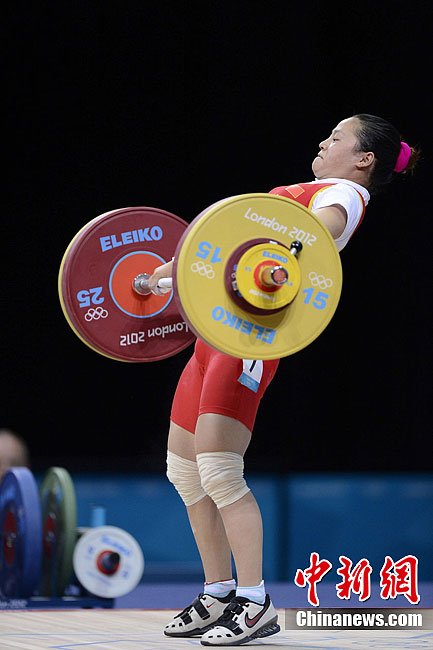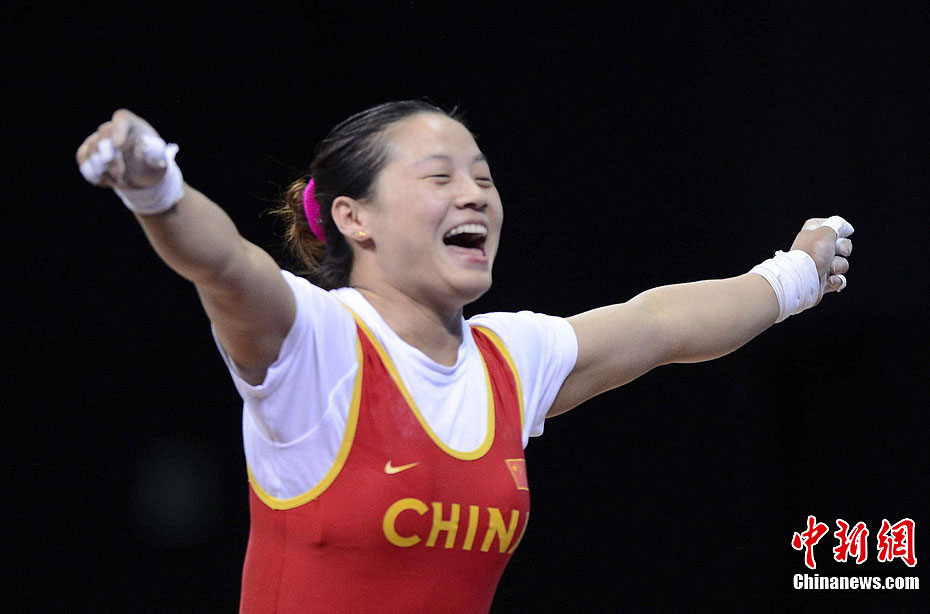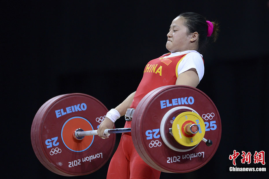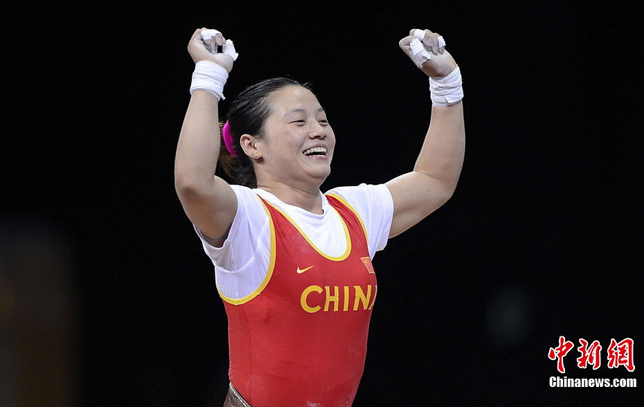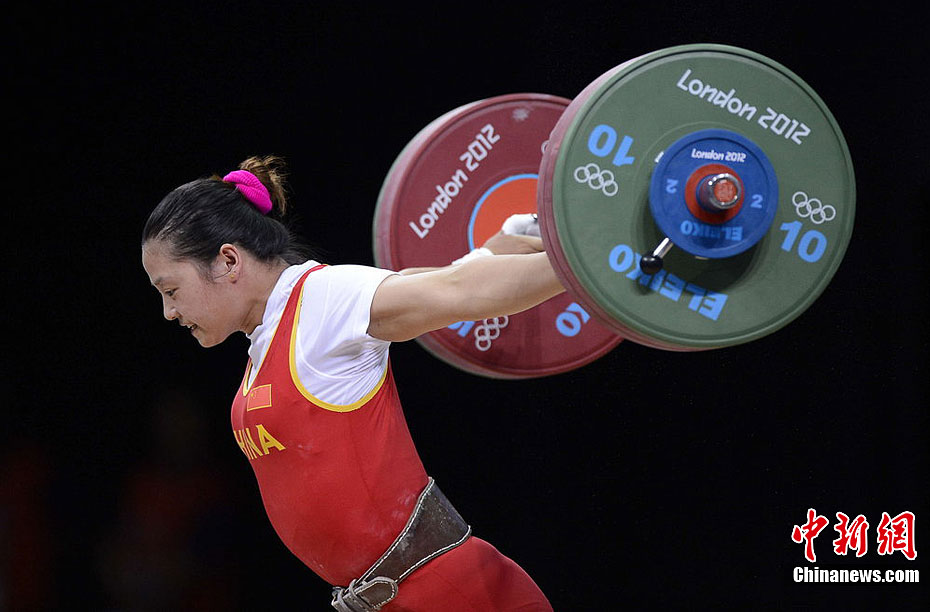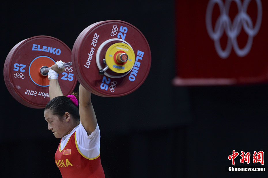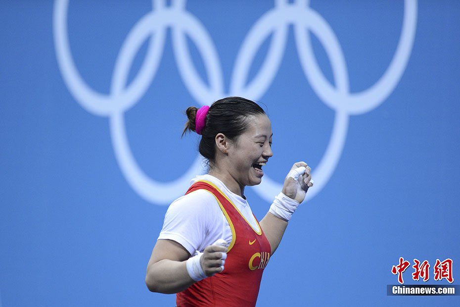 当地时间7月30日,伦敦奥运会女子举重58公斤级比赛中,22岁的中国选手李雪英以246公斤的总成绩夺冠,总成绩及抓举成绩打破奥运会纪录。记者 盛佳鹏 摄