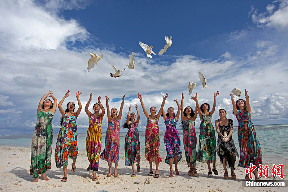 近日,“第一美差——2012海南国际旅游岛形象大使选拔”的佳丽们亮相三沙市永兴岛,在三沙市地名碑前,展开五星红旗,放飞和平鸽,表达美丽的爱国情怀。图为佳丽们在三沙市放飞和平鸽。中新社发 骆云飞 摄