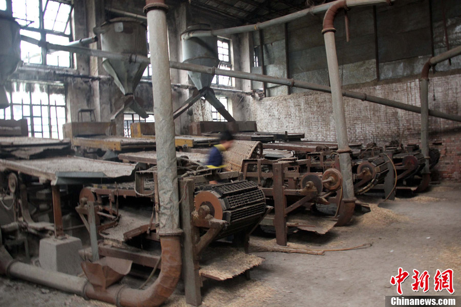 9月6日,伴着一场颇具寒意的秋雨,河北泊头火柴有限公司最后一批设备的资产处置拍卖会在泊头举行。这意味着这座曾经是亚洲最大的百年火柴生产厂家将在瑟瑟秋雨中彻底走进历史。图为泊头火柴厂车间已经生锈的生产设备。中新社发 陈昊 摄