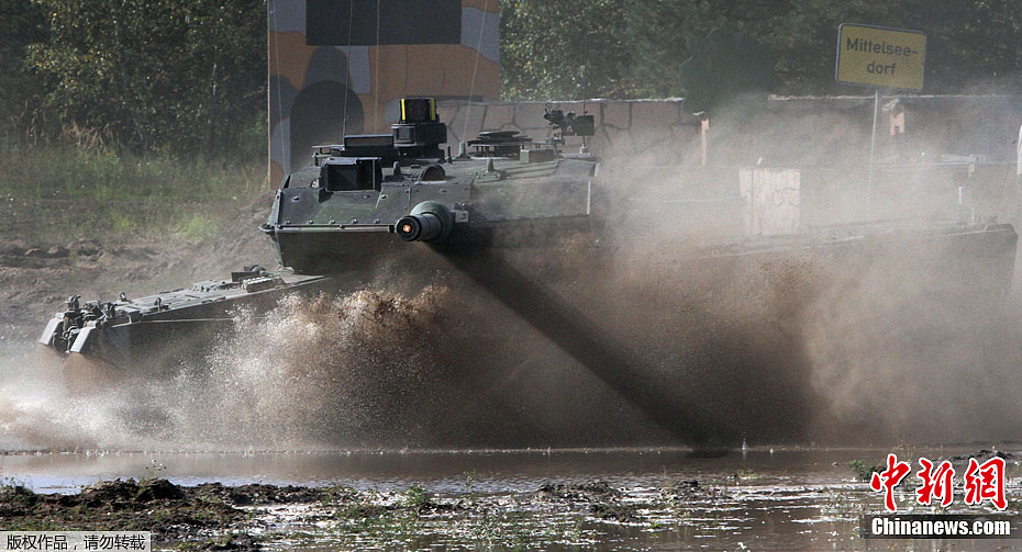 当地时间9月19日,德国联邦国防军陆军在西北部的明斯特地区举行大规模军事演习。图为德国“豹II”主战坦克涉水行进。