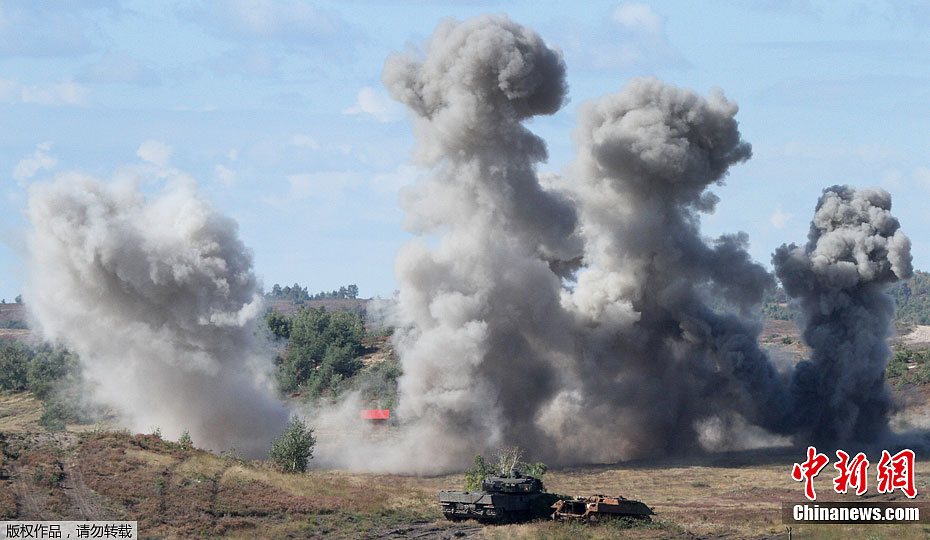 当地时间9月19日,德国联邦国防军陆军在西北部的明斯特地区举行大规模军事演习。图为德国“豹II”主战坦克在演习现场。