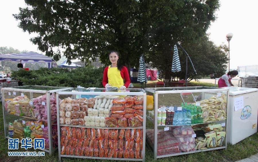 2012年9月24日,为期四天的第八届平壤秋季国际商品展览会在平壤三大革命展示馆开幕。共有来自朝鲜、中国、澳大利亚、德国、俄罗斯、马来西亚等10多个国家和地区的210多家企业参展,展示涉及汽车、机械、电子、通讯、太阳能、电机、食品和日用品等领域的1300多种商品。图为展览会展馆外,一名售货员在食物和饮料柜台等待顾客。杜白羽 摄 图片来源:新华网