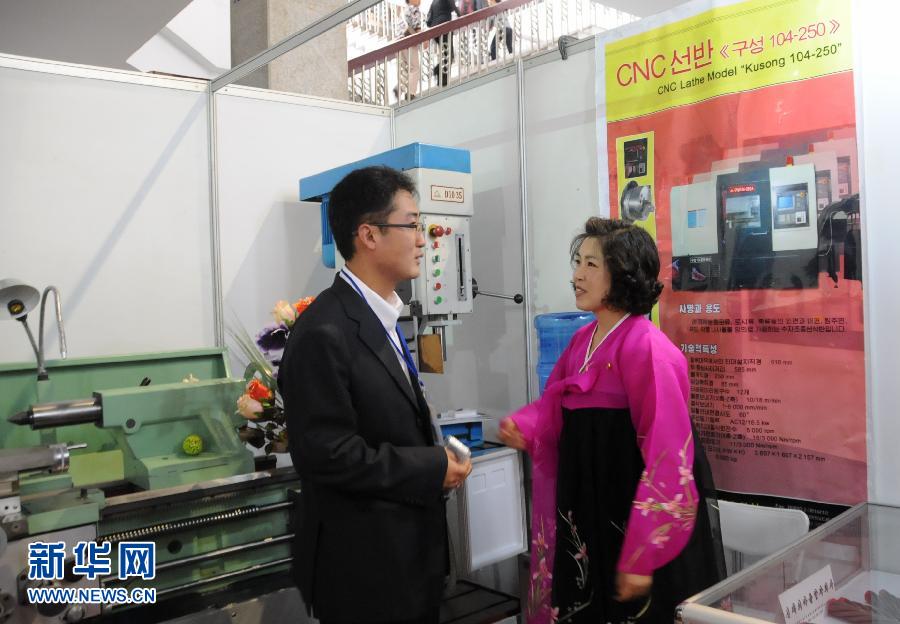 2012年9月24日,为期四天的第八届平壤秋季国际商品展览会在平壤三大革命展示馆开幕。共有来自朝鲜、中国、澳大利亚、德国、俄罗斯、马来西亚等10多个国家和地区的210多家企业参展,展示涉及汽车、机械、电子、通讯、太阳能、电机、食品和日用品等领域的1300多种商品。图为展览会上,一名销售人员在展台介绍商品。杜白羽 摄 图片来源:新华网