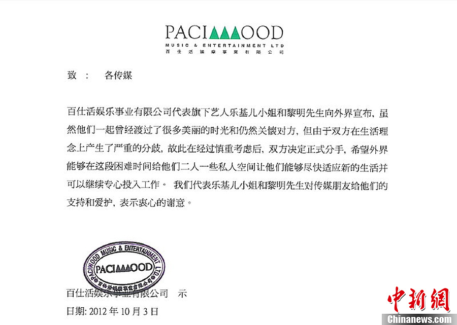 10月3日,香港,黎明与乐基儿一段相距14岁的4年婚姻宣布结束,10月3日两人透过经理人公司“百士活”向传媒发布分手声明。图为分手声明。图片来源:东方IC 版权作品 请勿转载
