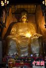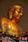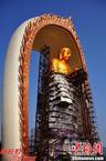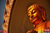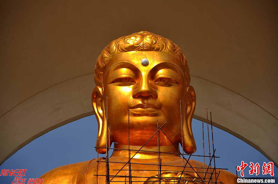 近日,江西省星子县在建的世界最高阿弥陀佛铜像——东林大佛工程接近尾声,东林大佛佛首塑金后已经露出真容。据了解,东林寺阿弥陀佛大铜像于2000年经国家宗教局批准建造,是迄今为止最高的阿弥陀佛铜像,高48米。东林大佛大铜像坐落江西庐山脚下,由佛教净土宗发源地东林寺投资兴建。图为露出真容的东林大佛。魏东升 摄