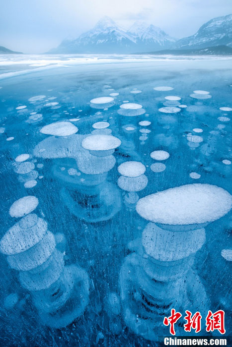加拿大阿尔伯塔省亚伯拉罕湖是一座人工湖,位于加拿大阿尔伯塔省北萨斯喀彻温河,这个人工湖每年冬天都会出现一种奇观——湖面下聚集着大量的冰冻气泡。据在当地拍照的摄影师说道,会出现这种现象,是亚伯拉罕湖湖床植物释放的沼气和湖面低温所致。沼气不停地涌向湖面,当气温降到一定程度时,湖面开始结冰,并将这些气泡形成的空腔一起保留下来,随着气温的降低,这些冰冻气泡就会不断地堆积起来,最后变成我们现在看到的样子。图片来源:东方IC 版权作品 请勿转载
