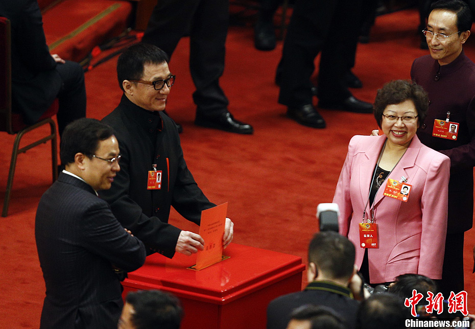 3月11日下午,全国政协十二届一次会议第四次全体会议在北京人民大会堂举行,选举产生新一届政协领导人。图为成龙投票。中新社发 张浩 摄
